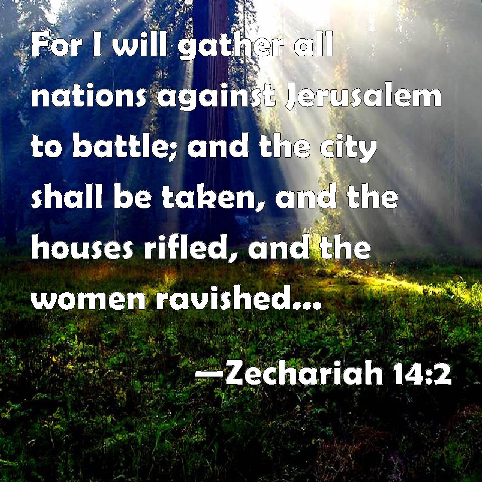 Choose a Background Zechariah 14:2 For I will gather all nations against Jerusalem to battle; and the city shall be taken, and the houses rifled, and the women ravished; and half of the city shall go forth into captivity, and the residue of the people shall not be cut off from the city. KJV: For I will gather all nations against Jerusalem to battle; and the city shall be taken, and the houses rifled, and the women ravished; and half of the city shall go forth into captivity, and the residue of the people shall not be cut off from the city. DRB: And I will gather all nations to Jerusalem to battle, and the city shall be taken, and the houses shall be rifled, and the women shall be defiled: and half of the city shall go forth into captivity, and the rest of the people shall not be taken away out of the city. DBT: And I will assemble all the nations against Jerusalem to battle; and the city shall be taken, and the houses rifled, and the women ravished; and half of the city shall go forth into captivity; and the rest of the people shall not be cut off from the city. ERV: For I will gather all nations against Jerusalem to battle; and the city shall be taken, and the houses rifled, and the women ravished: and half of the city shall go forth into captivity, and the residue of the people shall not be cut off from the city. WBT: For I will gather all nations against Jerusalem to battle; and the city shall be taken, and the houses rifled, and the women ravished; and half of the city shall go forth into captivity, and the residue of the people shall not be cut off from the city. WEB: For I will gather all nations against Jerusalem to battle; and the city will be taken, the houses rifled, and the women ravished. Half of the city will go out into captivity, and the rest of the people will not be cut off from the city. YLT: And I have gathered all the nations unto Jerusalem to battle, And captured hath been the city, And spoiled have been the houses, And the women are lain with, Gone forth hath half the city in a removal, And the remnant of the people are not cut off from the city.Links Zechariah 14:2 NIV • Zechariah 14:2 NLT • Zechariah 14:2 ESV • Zechariah 14:2 NASB • Zechariah 14:2 KJV • Zechariah 14:2 Interlinear • Zechariah 14:2 Commentaries • Zechariah 14:2 Parallel Texts • Zechariah 14:2 Bible Apps • Zechariah 14:2 Parallel • Bible Hub |
