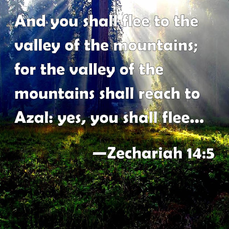 Choose a Background Zechariah 14:5 And you shall flee to the valley of the mountains; for the valley of the mountains shall reach to Azal: yes, you shall flee, like as you fled from before the earthquake in the days of Uzziah king of Judah: and the LORD my God shall come, and all the saints with you. KJV: And ye shall flee to the valley of the mountains; for the valley of the mountains shall reach unto Azal: yea, ye shall flee, like as ye fled from before the earthquake in the days of Uzziah king of Judah: and the LORD my God shall come, and all the saints with thee. DRB: And you shall flee to the valley of those mountains, for the valley of the mountains shall be joined even to the next, and you shall flee r as you fled from the face of the earthquake in the days of Ozias king of Juda: and the Lord my God shall come, and all the saints with him. DBT: And ye shall flee by the valley of my mountains; for the valley of the mountains shall reach unto Azal: ye shall even flee, like as ye fled from before the earthquake in the days of Uzziah king of Judah. And Jehovah my God shall come, and all the holy ones with thee. ERV: And ye shall flee by the valley of my mountains; for the valley of the mountains shall reach unto Azel: yea, ye shall flee, like as ye fled from before the earthquake in the days of Uzziah king of Judah: and the LORD my God shall come, and all the holy ones with thee. WBT: And ye shall flee to the valley of the mountains; for the valley of the mountains shall reach to Azal: yes, ye shall flee as ye fled from before the earthquake in the days of Uzziah king of Judah: and the LORD my God shall come, and all the saints with thee. WEB: You shall flee by the valley of my mountains; for the valley of the mountains shall reach to Azel; yes, you shall flee, just like you fled from before the earthquake in the days of Uzziah king of Judah. Yahweh my God will come, and all the holy ones with you. YLT: And ye have fled to the valley of My mountains, For join doth the valley of the mountains to Azal, And ye have fled as ye fled before the shaking, In the days of Uzziah king of Judah, And come in hath Jehovah my God, All holy ones are with Thee.Links Zechariah 14:5 NIV • Zechariah 14:5 NLT • Zechariah 14:5 ESV • Zechariah 14:5 NASB • Zechariah 14:5 KJV • Zechariah 14:5 Interlinear • Zechariah 14:5 Commentaries • Zechariah 14:5 Parallel Texts • Zechariah 14:5 Bible Apps • Zechariah 14:5 Parallel • Bible Hub |