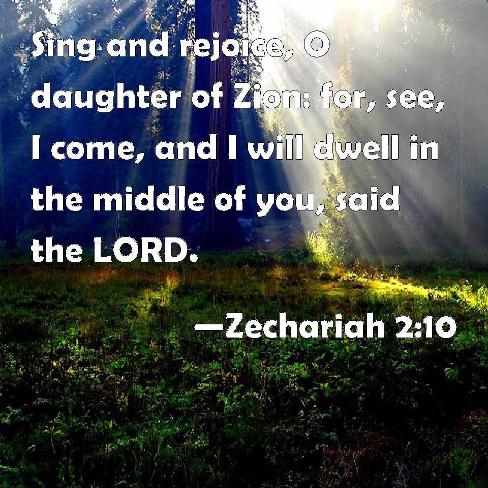 Choose a Background Zechariah 2:10 Sing and rejoice, O daughter of Zion: for, see, I come, and I will dwell in the middle of you, said the LORD. KJV: Sing and rejoice, O daughter of Zion: for, lo, I come, and I will dwell in the midst of thee, saith the LORD. DRB: Sing praise, and rejoice, O daughter of Sion: for behold I come, and I will dwell in the midst of thee: saith the Lord. DBT: Sing aloud and rejoice, daughter of Zion; for behold, I come, and I will dwell in the midst of thee, saith Jehovah. ERV: Sing and rejoice, O daughter of Zion: for, lo, I come, and I will dwell in the midst of thee, saith the LORD. WBT: Sing, and rejoice, O daughter of Zion: for lo, I come, and I will dwell in the midst of thee, saith the LORD. WEB: Sing and rejoice, daughter of Zion; for, behold, I come, and I will dwell in the midst of you,' says Yahweh. YLT: Singe, and rejoice, O daughter of Zion, For lo, I am coming, and have dwelt in thy midst, An affirmation of Jehovah.Links Zechariah 2:10 NIV • Zechariah 2:10 NLT • Zechariah 2:10 ESV • Zechariah 2:10 NASB • Zechariah 2:10 KJV • Zechariah 2:10 Interlinear • Zechariah 2:10 Commentaries • Zechariah 2:10 Parallel Texts • Zechariah 2:10 Bible Apps • Zechariah 2:10 Parallel • Bible Hub |