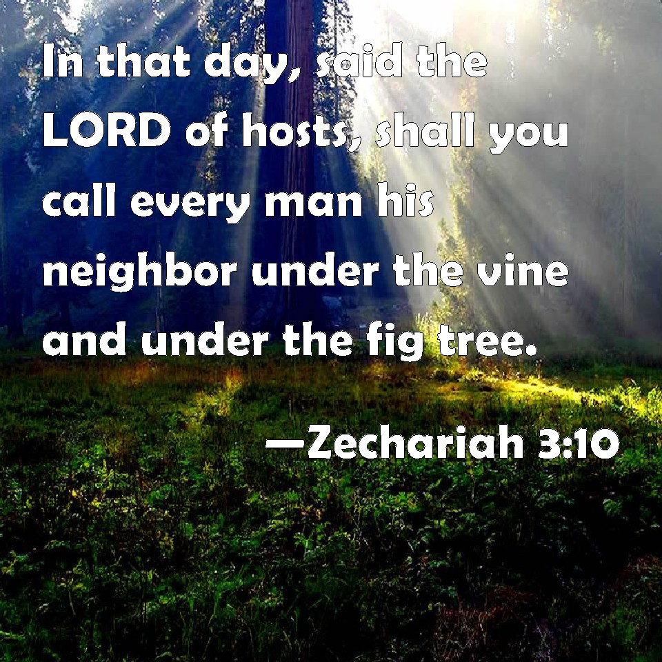 Choose a Background Zechariah 3:10 In that day, said the LORD of hosts, shall you call every man his neighbor under the vine and under the fig tree. KJV: In that day, saith the LORD of hosts, shall ye call every man his neighbour under the vine and under the fig tree. DRB: In that day, saith the Lord of hosts, every man shell call his friend under the vine and under the fig tree. DBT: In that day, saith Jehovah of hosts, shall ye invite every man his neighbour under the vine and under the fig-tree. ERV: In that day, saith the LORD of hosts, shall ye call every man his neighbour under the vine and under the fig tree. WBT: In that day, saith the LORD of hosts, shall ye call every man his neighbor under the vine and under the fig-tree. WEB: In that day,' says Yahweh of Armies, 'you will invite every man his neighbor under the vine and under the fig tree.'" YLT: In that day — an affirmation of Jehovah of Hosts, Ye do call, each unto his neighbour, Unto the place of the vine, And unto the place of the fig-tree!'Links Zechariah 3:10 NIV • Zechariah 3:10 NLT • Zechariah 3:10 ESV • Zechariah 3:10 NASB • Zechariah 3:10 KJV • Zechariah 3:10 Interlinear • Zechariah 3:10 Commentaries • Zechariah 3:10 Parallel Texts • Zechariah 3:10 Bible Apps • Zechariah 3:10 Parallel • Bible Hub |