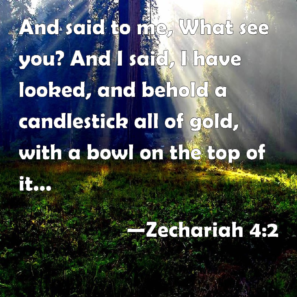 Choose a Background Zechariah 4:2 And said to me, What see you? And I said, I have looked, and behold a candlestick all of gold, with a bowl on the top of it, and his seven lamps thereon, and seven pipes to the seven lamps, which are on the top thereof: KJV: And said unto me, What seest thou? And I said, I have looked, and behold a candlestick all of gold, with a bowl upon the top of it, and his seven lamps thereon, and seven pipes to the seven lamps, which are upon the top thereof: DRB: And he said to me: What seest thou? And I said: I have looked, and behold a candlestick all of gold, and its lamp upon the top of it: and the seven lights thereof upon it: and seven funnels for the lights that were upon the top thereof. DBT: And he said unto me, What seest thou? And I said, I see, and behold, a lamp-stand all of gold, with a bowl upon the top of it, and its seven lamps thereon, seven lamps and seven pipes to the lamps, which are upon the top thereof; ERV: And he said unto me, What seest thou? And I said, I have seen, and behold, a candlestick all of gold, with its bowl upon the top of it, and its seven lamps thereon; there are seven pipes to each of the lamps, which are upon the top thereof: WBT: And said to me, What seest thou? And I said, I have looked, and behold a candlestick: all of gold, with a bowl upon the top of it, and its seven lamps, and seven pipes to the seven lamps, which were upon the top of it. WEB: He said to me, "What do you see?" I said, "I have seen, and behold, a lampstand all of gold, with its bowl on the top of it, and its seven lamps thereon; there are seven pipes to each of the lamps, which are on the top of it; YLT: and he saith unto me, 'What art thou seeing?' And I say, 'I have looked, and lo, a candlestick of gold — all of it, and its bowl is on its top, and its seven lamps are upon it, and twice seven pipes are to the lights that are on its top,Links Zechariah 4:2 NIV • Zechariah 4:2 NLT • Zechariah 4:2 ESV • Zechariah 4:2 NASB • Zechariah 4:2 KJV • Zechariah 4:2 Interlinear • Zechariah 4:2 Commentaries • Zechariah 4:2 Parallel Texts • Zechariah 4:2 Bible Apps • Zechariah 4:2 Parallel • Bible Hub |