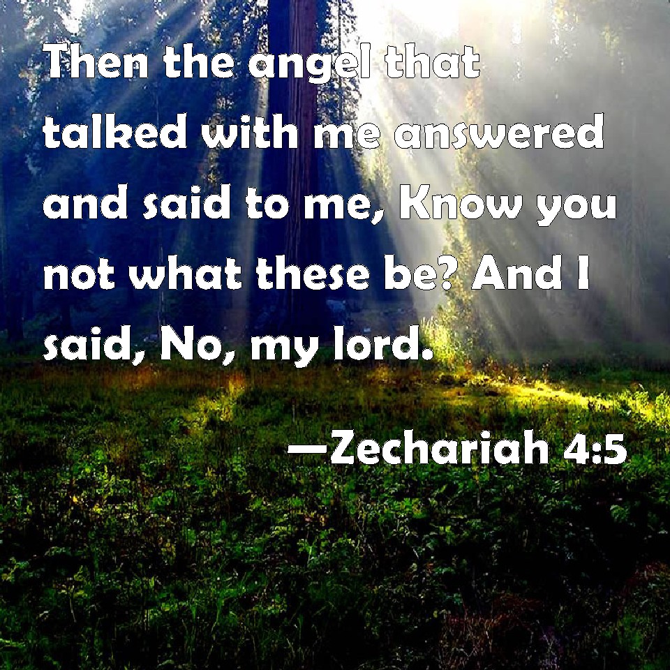 Choose a Background Zechariah 4:5 Then the angel that talked with me answered and said to me, Know you not what these be? And I said, No, my lord. KJV: Then the angel that talked with me answered and said unto me, Knowest thou not what these be? And I said, No, my lord. DRB: And the angel that spoke in me answered, and said to me: Knowest thou not what these things are? And I said: No, my lord. DBT: And the angel that talked with me answered and said unto me, Knowest thou not what these are? And I said, No, my lord. ERV: Then the angel that talked with me answered and said unto me, Knowest thou not what these be? And I said, No, my lord. WBT: Then the angel that talked with me answered and said to me, Knowest thou not what these are? and I said, No, my lord. WEB: Then the angel who talked with me answered me, "Don't you know what these are?" I said, "No, my lord." YLT: And the messenger who is speaking with me answereth and saith unto me, 'Hast thou not known what these are?' And I say, 'No, my lord.'Links Zechariah 4:5 NIV • Zechariah 4:5 NLT • Zechariah 4:5 ESV • Zechariah 4:5 NASB • Zechariah 4:5 KJV • Zechariah 4:5 Interlinear • Zechariah 4:5 Commentaries • Zechariah 4:5 Parallel Texts • Zechariah 4:5 Bible Apps • Zechariah 4:5 Parallel • Bible Hub |