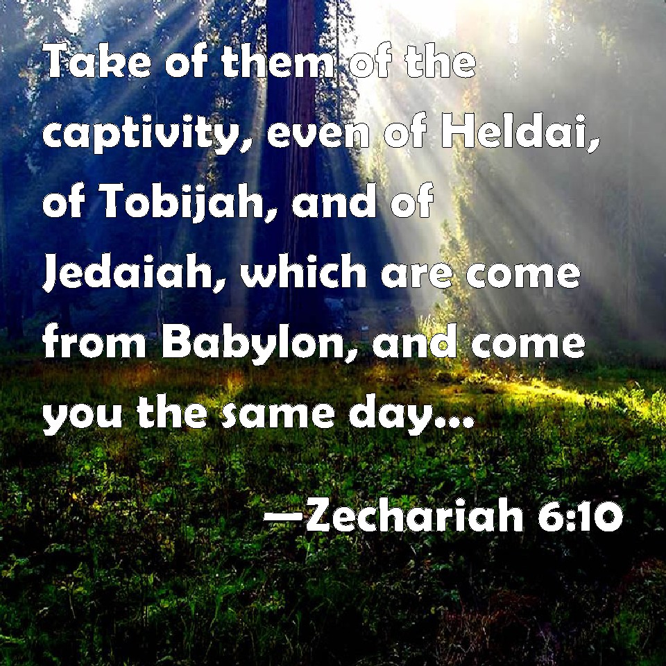 Choose a Background Zechariah 6:10 Take of them of the captivity, even of Heldai, of Tobijah, and of Jedaiah, which are come from Babylon, and come you the same day, and go into the house of Josiah the son of Zephaniah; KJV: Take of them of the captivity, even of Heldai, of Tobijah, and of Jedaiah, which are come from Babylon, and come thou the same day, and go into the house of Josiah the son of Zephaniah; DRB: Take of them of the captivity, of Holdai, and of Tobias, and of Idaias; thou shalt come in that day, and shalt go into the house of Josias, the son of Sophonias, who came out of Babylon. DBT: Take gifts of them of the captivity, of Heldai, of Tobijah, and of Jedaiah, and come thou the same day, and enter into the house of Josiah the son of Zephaniah, whither they are come from Babylon; ERV: Take of them of the captivity, even of Heldai, of Tobijah, and of Jedaiah; and come thou the same day, and go into the house of Josiah the son of Zephaniah, whither they are come from Babylon; WBT: Take of them of the captivity, even of Heldai, of Tobijah, and of Jedaiah, who are come from Babylon, and come thou the same day, and go into the house of Josiah the son of Zephaniah; WEB: "Take of them of the captivity, even of Heldai, of Tobijah, and of Jedaiah; and come the same day, and go into the house of Josiah the son of Zephaniah, where they have come from Babylon. YLT: to take of the captivity (who came from Babylon) from Heldai, from Tobijah, and from Jedaiah, 'and thou hast come in — thou, in that day, yea, thou hast come into the house of Josiah son of Zephaniah,Links Zechariah 6:10 NIV • Zechariah 6:10 NLT • Zechariah 6:10 ESV • Zechariah 6:10 NASB • Zechariah 6:10 KJV • Zechariah 6:10 Interlinear • Zechariah 6:10 Commentaries • Zechariah 6:10 Parallel Texts • Zechariah 6:10 Bible Apps • Zechariah 6:10 Parallel • Bible Hub |