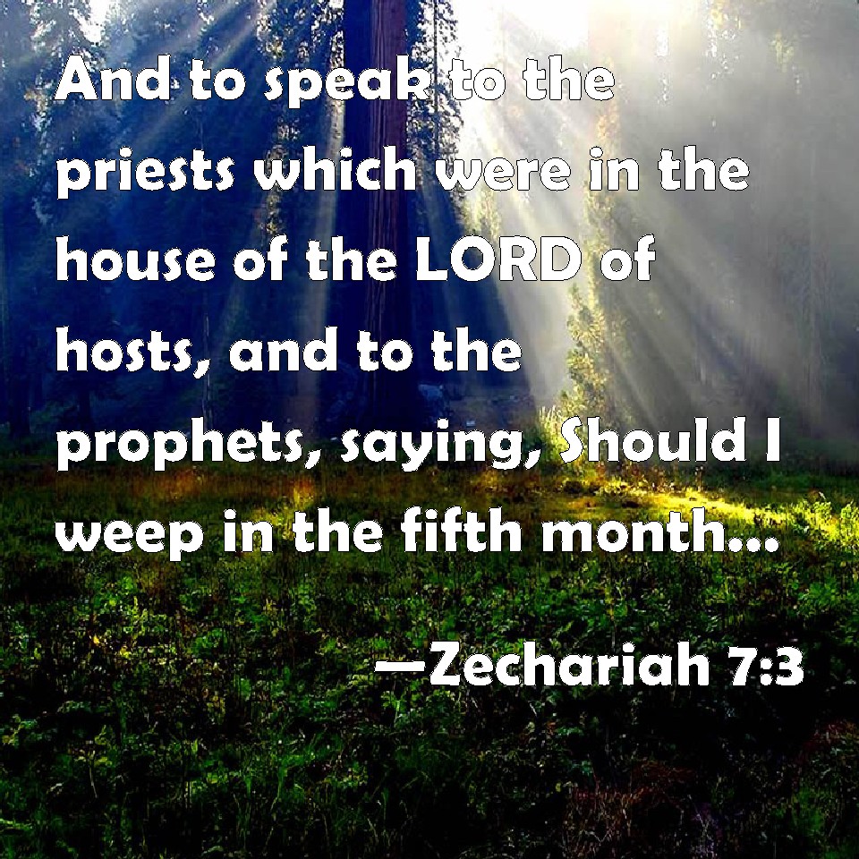 Choose a Background Zechariah 7:3 And to speak to the priests which were in the house of the LORD of hosts, and to the prophets, saying, Should I weep in the fifth month, separating myself, as I have done these so many years? KJV: And to speak unto the priests which were in the house of the LORD of hosts, and to the prophets, saying, Should I weep in the fifth month, separating myself, as I have done these so many years? DRB: To speak to the priests of the house of the Lord of hosts, and to the prophets, saying: Must I weep in the fifth month, or must I sanctify myself as I have now done for many years? DBT: and to speak unto the priests that were in the house of Jehovah of hosts, and to the prophets, saying, Should I weep in the fifth month, separating myself, as I have done now so many years? ERV: and to speak unto the priests of the house of the LORD of hosts, and to the prophets, saying, Should I weep in the fifth month, separating myself, as I have done these so many years? WBT: And to speak to the priests who were in the house of the LORD of hosts, and to the prophets, saying, Should I weep in the fifth month, separating myself, as I have done these so many years? WEB: and to speak to the priests of the house of Yahweh of Armies, and to the prophets, saying, "Should I weep in the fifth month, separating myself, as I have done these so many years?" YLT: speaking unto the priests who are at the house of Jehovah of Hosts, and unto the prophets, saying, 'Do I weep in the fifth month — being separated — as I have done these so many years?'Links Zechariah 7:3 NIV • Zechariah 7:3 NLT • Zechariah 7:3 ESV • Zechariah 7:3 NASB • Zechariah 7:3 KJV • Zechariah 7:3 Interlinear • Zechariah 7:3 Commentaries • Zechariah 7:3 Parallel Texts • Zechariah 7:3 Bible Apps • Zechariah 7:3 Parallel • Bible Hub |
