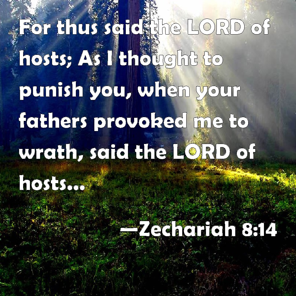 Choose a Background Zechariah 8:14 For thus said the LORD of hosts; As I thought to punish you, when your fathers provoked me to wrath, said the LORD of hosts, and I repented not: KJV: For thus saith the LORD of hosts; As I thought to punish you, when your fathers provoked me to wrath, saith the LORD of hosts, and I repented not: DRB: For thus saith the Lord of hosts: As I purposed to afflict you, when your fathers had provoked me to wrath, saith the Lord, DBT: For thus saith Jehovah of hosts: Like as I thought to do you evil when your fathers provoked me to wrath, saith Jehovah of hosts, and I repented not; ERV: For thus saith the LORD of hosts: As I thought to do evil unto you, when your fathers provoked me to wrath, saith the LORD of hosts, and I repented not; WBT: For thus saith the LORD of hosts; As I thought to punish you, when your fathers provoked me to wrath, saith the LORD of hosts, and I repented not; WEB: For thus says Yahweh of Armies: "As I thought to do evil to you, when your fathers provoked me to wrath," says Yahweh of Armies, "and I didn't repent; YLT: For, thus said Jehovah of Hosts, As I did purpose to do evil to you, When your fathers made Me wroth, Said Jehovah of Hosts, and I did not repent,Links Zechariah 8:14 NIV • Zechariah 8:14 NLT • Zechariah 8:14 ESV • Zechariah 8:14 NASB • Zechariah 8:14 KJV • Zechariah 8:14 Interlinear • Zechariah 8:14 Commentaries • Zechariah 8:14 Parallel Texts • Zechariah 8:14 Bible Apps • Zechariah 8:14 Parallel • Bible Hub |