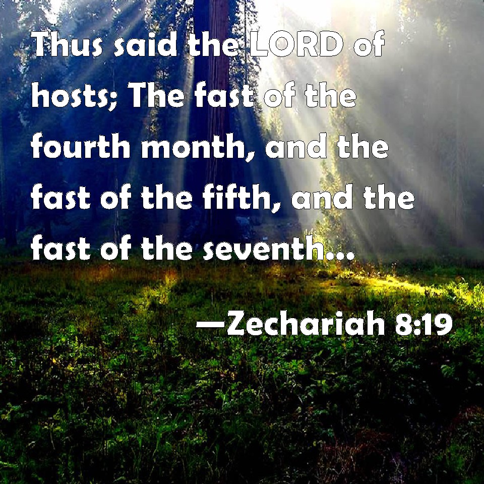 Choose a Background Zechariah 8:19 Thus said the LORD of hosts; The fast of the fourth month, and the fast of the fifth, and the fast of the seventh, and the fast of the tenth, shall be to the house of Judah joy and gladness, and cheerful feasts; therefore love the truth and peace. KJV: Thus saith the LORD of hosts; The fast of the fourth month, and the fast of the fifth, and the fast of the seventh, and the fast of the tenth, shall be to the house of Judah joy and gladness, and cheerful feasts; therefore love the truth and peace. DRB: Thus saith the Lord of hosts: The fast of the fourth month, and the fast of the fifth, and the fast of the seventh, and the fast of the tenth shall be to the house of Juda, joy, and gladness, and great solemnities: only love ye truth and peace. DBT: Thus saith Jehovah of hosts: The fast of the fourth month and the fast of the fifth, and the fast of the seventh, and the fast of the tenth, shall be to the house of Judah joy and gladness, and cheerful gatherings. Love ye then truth and peace. ERV: Thus saith the LORD of hosts: The fast of the fourth month, and the fast of the fifth, and the fast of the seventh, and the fast of the tenth, shall be to the house of Judah joy and gladness, and cheerful feasts; therefore love truth and peace. WBT: Thus saith the LORD of hosts; The fast of the fourth month, and the fast of the fifth, and the fast of the seventh, and the fast of the tenth, shall be to the house of Judah joy and gladness, and cheerful feasts; therefore love the truth and peace. WEB: Thus says Yahweh of Armies: "The fasts of the fourth fifth, seventh, and tenth months shall be for the house of Judah joy and gladness, and cheerful feasts. Therefore love truth and peace." YLT: Thus said Jehovah of Hosts: The fast of the fourth, and the fast of the fifth, and the fast of the seventh, and the fast of the tenth months, are to the house of Judah for joy and for rejoicing, and for pleasant appointed seasons, and the truth and the peace they have loved.Links Zechariah 8:19 NIV • Zechariah 8:19 NLT • Zechariah 8:19 ESV • Zechariah 8:19 NASB • Zechariah 8:19 KJV • Zechariah 8:19 Interlinear • Zechariah 8:19 Commentaries • Zechariah 8:19 Parallel Texts • Zechariah 8:19 Bible Apps • Zechariah 8:19 Parallel • Bible Hub |