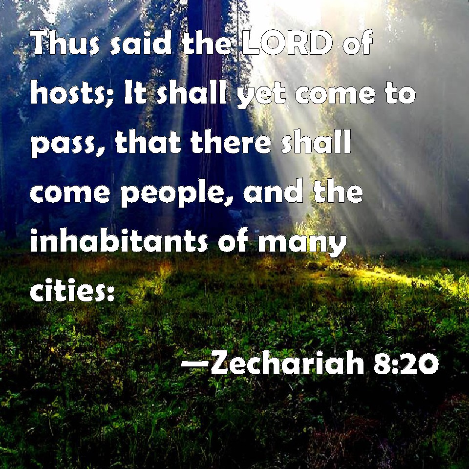 Choose a Background Zechariah 8:20 Thus said the LORD of hosts; It shall yet come to pass, that there shall come people, and the inhabitants of many cities: KJV: Thus saith the LORD of hosts; It shall yet come to pass, that there shall come people, and the inhabitants of many cities: DRB: Thus saith the Lord of hosts, until people come, and dwell in many cities, DBT: Thus saith Jehovah of hosts: Yet again shall there come peoples, and the inhabitants of many cities; ERV: Thus saith the LORD of hosts: It shall yet come to pass, that there shall come peoples, and the inhabitants of many cities: WBT: Thus saith the LORD of hosts: It shall yet come to pass, that there shall come people, and the inhabitants of many cities: WEB: Thus says Yahweh of Armies: "Many peoples, and the inhabitants of many cities will yet come; YLT: Thus said Jehovah of Hosts: Yet come do peoples, and inhabitants of many cities,Links Zechariah 8:20 NIV • Zechariah 8:20 NLT • Zechariah 8:20 ESV • Zechariah 8:20 NASB • Zechariah 8:20 KJV • Zechariah 8:20 Interlinear • Zechariah 8:20 Commentaries • Zechariah 8:20 Parallel Texts • Zechariah 8:20 Bible Apps • Zechariah 8:20 Parallel • Bible Hub |