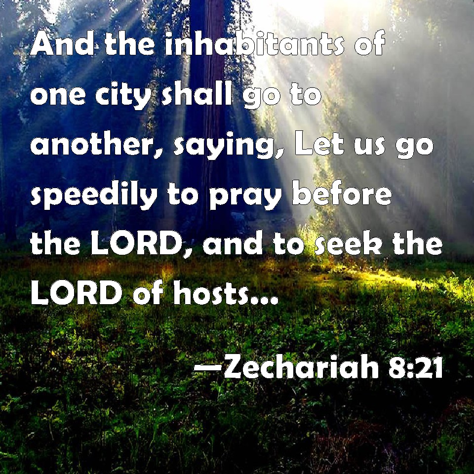 Choose a Background Zechariah 8:21 And the inhabitants of one city shall go to another, saying, Let us go speedily to pray before the LORD, and to seek the LORD of hosts: I will go also. KJV: And the inhabitants of one city shall go to another, saying, Let us go speedily to pray before the LORD, and to seek the LORD of hosts: I will go also. DRB: And the inhabitants go one to another, saying: Let us go, and entreat the face of the Lord, and let us seek the Lord of hosts: I also will go. DBT: and the inhabitants of one city shall go to another, saying, Let us go speedily to supplicate Jehovah, and to seek Jehovah of hosts: I will go also. ERV: and the inhabitants of one city shall go to another, saying, Let us go speedily to entreat the favour of the LORD, and to seek the LORD of hosts: I will go also. WBT: And the inhabitants of one city shall go to another, saying, Let us go speedily to pray before the LORD, and to seek the LORD of hosts: I will go also. WEB: and the inhabitants of one shall go to another, saying, 'Let us go speedily to entreat the favor of Yahweh, and to seek Yahweh of Armies. I will go also.' YLT: Yea, gone have inhabitants of one To another, saying: We go diligently, To appease the face of Jehovah, To seek Jehovah of Hosts — I go, even I.Links Zechariah 8:21 NIV • Zechariah 8:21 NLT • Zechariah 8:21 ESV • Zechariah 8:21 NASB • Zechariah 8:21 KJV • Zechariah 8:21 Interlinear • Zechariah 8:21 Commentaries • Zechariah 8:21 Parallel Texts • Zechariah 8:21 Bible Apps • Zechariah 8:21 Parallel • Bible Hub |
