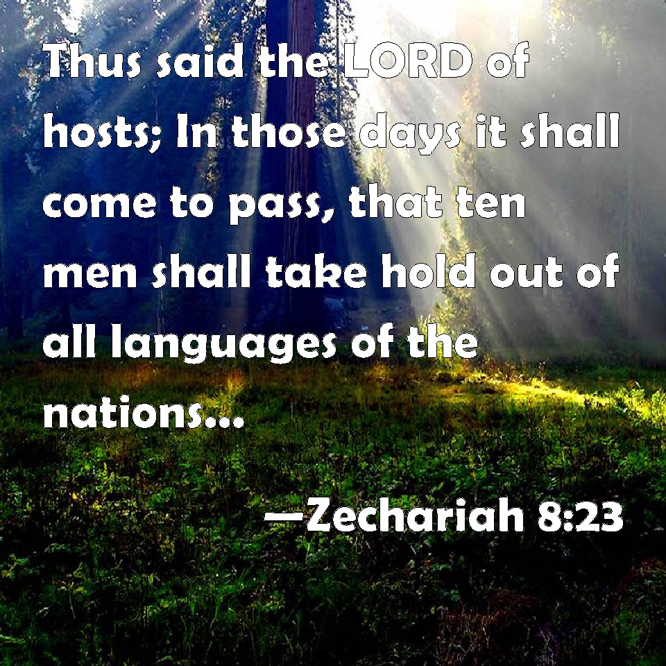 Choose a Background Zechariah 8:23 Thus said the LORD of hosts; In those days it shall come to pass, that ten men shall take hold out of all languages of the nations, even shall take hold of the skirt of him that is a Jew, saying, We will go with you: for we have heard that God is with you. KJV: Thus saith the LORD of hosts; In those days it shall come to pass, that ten men shall take hold out of all languages of the nations, even shall take hold of the skirt of him that is a Jew, saying, We will go with you: for we have heard that God is with you. DRB: Thus saith the Lord of hosts : In those days, wherein ten men of all languages of the Gentiles shall take hold, and shall hold fast the shirt of one that is a Jew, saying: We will go with you: for we have heard that God is with you. DBT: Thus saith Jehovah of hosts: In those days shall ten men take hold, out of all languages of the nations, shall even take hold of the skirt of him that is a Jew, saying, We will go with you; for we have heard that God is with you. ERV: Thus saith the LORD of hosts: In those days it shall come to pass, that ten men shall take hold, out of all the languages of the nations, shall even take hold of the skirt of him that is a Jew, saying, We will go with you, for we have heard that God is with you. WBT: Thus saith the LORD of hosts: In those days it shall come to pass, that ten men out of all languages of the nations, shall take hold, shall even take hold of the skirt of him that is a Jew, saying, We will go with you: for we have heard that God is with you. WEB: Thus says Yahweh of Armies: "In those days, ten men will take hold, out of all the languages of the nations, they will take hold of the skirt of him who is a Jew, saying, 'We will go with you, for we have heard that God is with you.'" YLT: Thus said Jehovah of Hosts: In those days take hold do ten men of all languages of the nations, Yea, they have taken hold on the skirt of a man, a Jew, saying: We go with you, for we heard God is with you!Links Zechariah 8:23 NIV • Zechariah 8:23 NLT • Zechariah 8:23 ESV • Zechariah 8:23 NASB • Zechariah 8:23 KJV • Zechariah 8:23 Interlinear • Zechariah 8:23 Commentaries • Zechariah 8:23 Parallel Texts • Zechariah 8:23 Bible Apps • Zechariah 8:23 Parallel • Bible Hub |