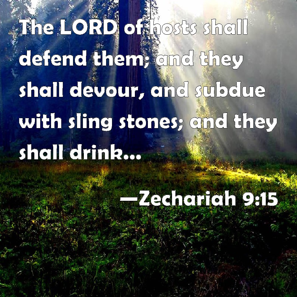 Choose a Background Zechariah 9:15 The LORD of hosts shall defend them; and they shall devour, and subdue with sling stones; and they shall drink, and make a noise as through wine; and they shall be filled like bowls, and as the corners of the altar. KJV: The LORD of hosts shall defend them; and they shall devour, and subdue with sling stones; and they shall drink, and make a noise as through wine; and they shall be filled like bowls, and as the corners of the altar. DRB: The Lord of hosts will protect them: and they shall devour, and subdue with the stones of the sling: and drinking they shall be inebriated as it were with wine, and they shall be filled as bowls, and as the horns of the altar. DBT: Jehovah of hosts will defend them; and they shall devour, and shall tread down the sling-stones; and they shall drink, and make a noise as from wine; and they shall be filled like a bowl, like the corners of the altar. ERV: The LORD of hosts shall defend them; and they shall devour, and shall tread down the sling stones; and they shall drink, and make a noise as through wine: and they shall be filled like bowls, like the corners of the altar. WBT: The LORD of hosts will defend them; and they shall devour, and subdue with sling-stones; and they shall drink, and make a noise as through wine; and they shall be filled like bowls, and as the corners of the altar. WEB: Yahweh of Armies will defend them; and they will destroy and overcome with sling stones; and they will drink, and roar as through wine; and they will be filled like bowls, like the corners of the altar. YLT: Jehovah of Hosts doth cover them over, And they consumed, and subdued sling-stones, Yea, they have drunk, They have made a noise as wine, And they have been full as a bowl, As corners of an altar.Links Zechariah 9:15 NIV • Zechariah 9:15 NLT • Zechariah 9:15 ESV • Zechariah 9:15 NASB • Zechariah 9:15 KJV • Zechariah 9:15 Interlinear • Zechariah 9:15 Commentaries • Zechariah 9:15 Parallel Texts • Zechariah 9:15 Bible Apps • Zechariah 9:15 Parallel • Bible Hub |