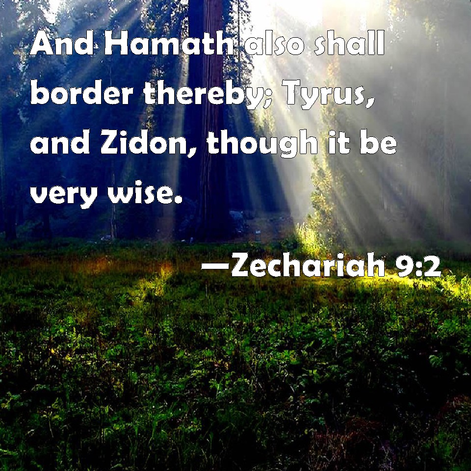 Choose a Background Zechariah 9:2 And Hamath also shall border thereby; Tyrus, and Zidon, though it be very wise. KJV: And Hamath also shall border thereby; Tyrus, and Zidon, though it be very wise. DRB: Emath also in the borders thereof, and Tyre, and Sidon: for they have taken to themselves to be exceeding wise. DBT: and also on Hamath which bordereth thereon; on Tyre and Zidon, though she be very wise. ERV: and Hamath also which bordereth thereon: Tyre and Zidon, because she is very wise. WBT: And Hamath also shall border by it; Tyre and Zidon, though it be very wise. WEB: and Hamath, also, which borders on it; Tyre and Sidon, because they are very wise. YLT: And also Hamath doth border thereon, Tyre and Zidon, for — very wise!Links Zechariah 9:2 NIV • Zechariah 9:2 NLT • Zechariah 9:2 ESV • Zechariah 9:2 NASB • Zechariah 9:2 KJV • Zechariah 9:2 Interlinear • Zechariah 9:2 Commentaries • Zechariah 9:2 Parallel Texts • Zechariah 9:2 Bible Apps • Zechariah 9:2 Parallel • Bible Hub |