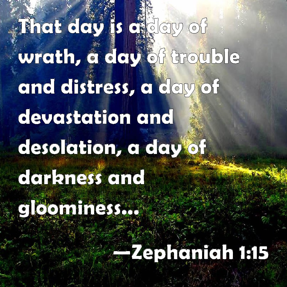 Choose a Background Zephaniah 1:15 That day is a day of wrath, a day of trouble and distress, a day of devastation and desolation, a day of darkness and gloominess, a day of clouds and thick darkness, KJV: That day is a day of wrath, a day of trouble and distress, a day of wasteness and desolation, a day of darkness and gloominess, a day of clouds and thick darkness, DRB: That day is a day of wrath, a day of tribulation and distress, a day of calamity and misery, a day of darkness and obscurity, a day of clouds and whirlwinds, DBT: That day is a day of wrath, a day of trouble and distress, a day of ruin and desolation, a day of darkness and gloom, a day of clouds and gross darkness, ERV: That day is a day of wrath, a day of trouble and distress, a day of wasteness and desolation, a day of darkness and gloominess, a day of clouds and thick darkness, WBT: That day is a day of wrath, a day of trouble and distress, a day of wasting and desolation, a day of darkness and gloominess, a day of clouds and thick darkness, WEB: That day is a day of wrath, a day of distress and anguish, a day of trouble and ruin, a day of darkness and gloom, a day of clouds and blackness, YLT: A day of wrath is that day, A day of adversity and distress, A day of waste and desolation, A day of darkness and gloominess, A day of cloud and thick darkness.Links Zephaniah 1:15 NIV • Zephaniah 1:15 NLT • Zephaniah 1:15 ESV • Zephaniah 1:15 NASB • Zephaniah 1:15 KJV • Zephaniah 1:15 Interlinear • Zephaniah 1:15 Commentaries • Zephaniah 1:15 Parallel Texts • Zephaniah 1:15 Bible Apps • Zephaniah 1:15 Parallel • Bible Hub |