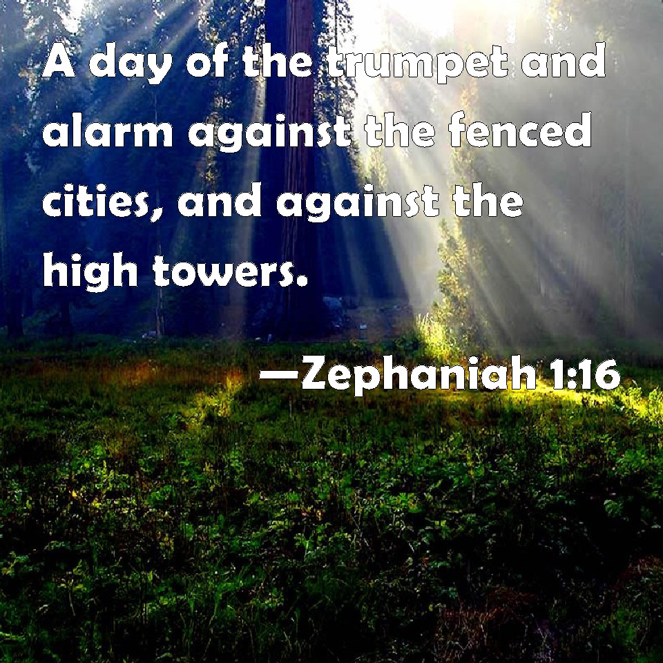 Choose a Background Zephaniah 1:16 A day of the trumpet and alarm against the fenced cities, and against the high towers. KJV: A day of the trumpet and alarm against the fenced cities, and against the high towers. DRB: A day of the trumpet and alarm against the fenced cities, and against the high bulwarks. DBT: a day of the trumpet and alarm, against the fenced cities and against the high battlements. ERV: a day of the trumpet and alarm, against the fenced cities, and against the high battlements. WBT: A day of the trumpet and alarm against the fortified cities, and against the high towers. WEB: a day of the trumpet and alarm, against the fortified cities, and against the high battlements. YLT: A day of trumpet and shouting against the fenced cities, And against the high corners.Links Zephaniah 1:16 NIV • Zephaniah 1:16 NLT • Zephaniah 1:16 ESV • Zephaniah 1:16 NASB • Zephaniah 1:16 KJV • Zephaniah 1:16 Interlinear • Zephaniah 1:16 Commentaries • Zephaniah 1:16 Parallel Texts • Zephaniah 1:16 Bible Apps • Zephaniah 1:16 Parallel • Bible Hub |