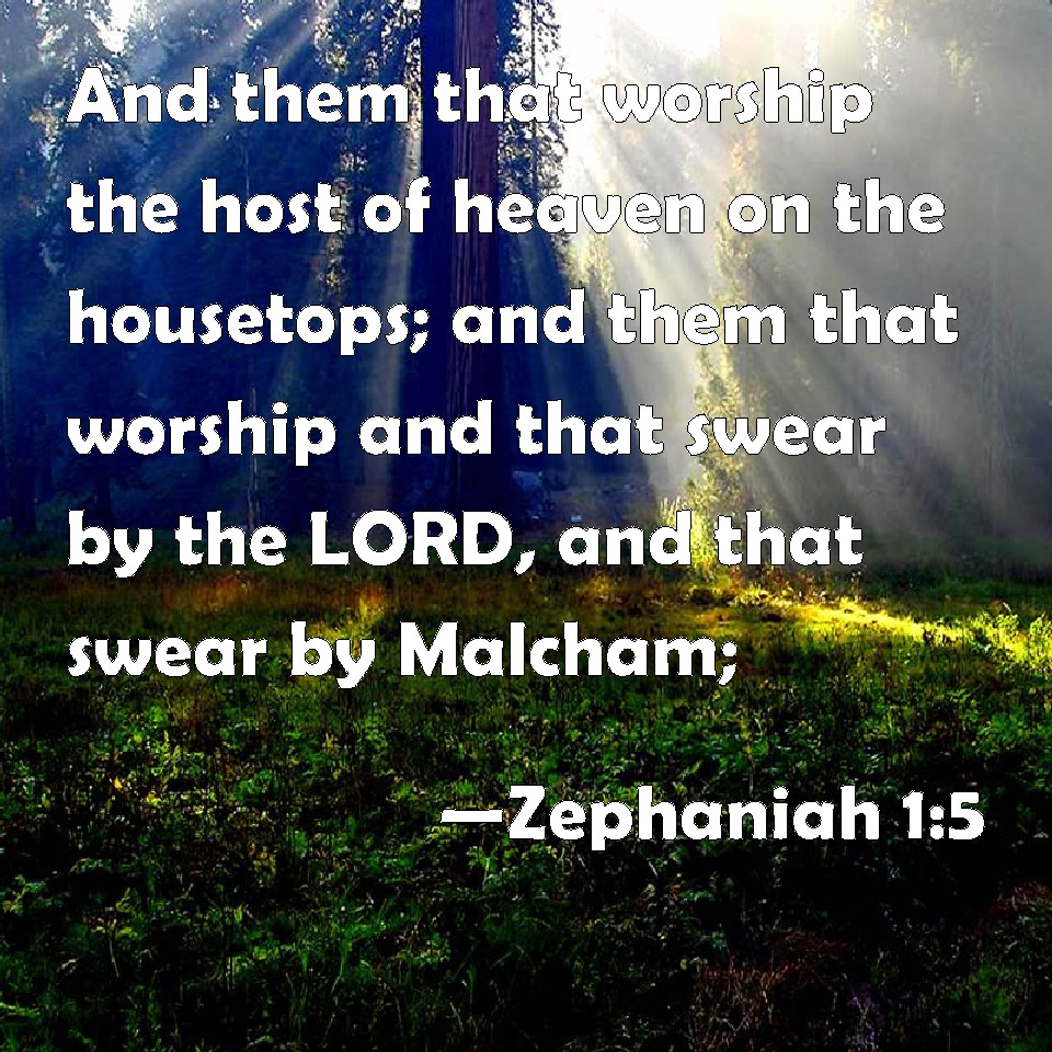 Choose a Background Zephaniah 1:5 And them that worship the host of heaven on the housetops; and them that worship and that swear by the LORD, and that swear by Malcham; KJV: And them that worship the host of heaven upon the housetops; and them that worship and that swear by the LORD, and that swear by Malcham; DRB: And them that worship the host of heaven upon the tops of houses, and them that adore, and swear by the Lord, and swear by Melchom. DBT: and them that bow down to the host of the heavens upon the housetops; and them that bow down to Jehovah, that swear by him, and swear by Malcham; ERV: and them that worship the host of heaven upon the housetops; and them that worship, which swear to the LORD and swear by Malcam; WBT: And them that worship the host of heaven upon the house-tops; and them that worship and that swear by the LORD, and that swear by Malcham; WEB: those who worship the army of the sky on the housetops, those who worship and swear by Yahweh and also swear by Malcam, YLT: And those bowing themselves On the roofs to the host of the heavens, And those bowing themselves, Swearing to Jehovah, and swearing by Malcham,Links Zephaniah 1:5 NIV • Zephaniah 1:5 NLT • Zephaniah 1:5 ESV • Zephaniah 1:5 NASB • Zephaniah 1:5 KJV • Zephaniah 1:5 Interlinear • Zephaniah 1:5 Commentaries • Zephaniah 1:5 Parallel Texts • Zephaniah 1:5 Bible Apps • Zephaniah 1:5 Parallel • Bible Hub |