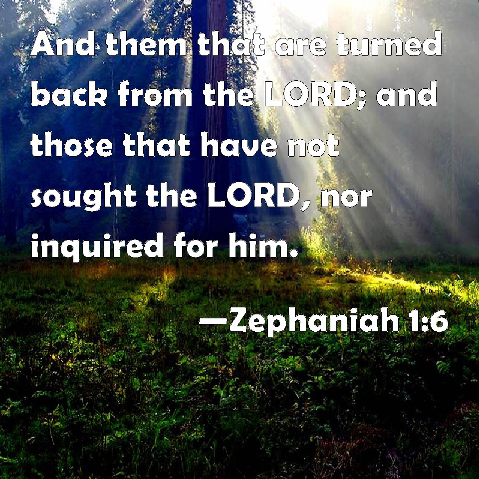Choose a Background Zephaniah 1:6 And them that are turned back from the LORD; and those that have not sought the LORD, nor inquired for him. KJV: And them that are turned back from the LORD; and those that have not sought the LORD, nor inquired for him. DRB: And them that turn away from following after the Lord, and that have not sought the Lord, nor searched after him. DBT: and them that turn back from after Jehovah, and that do not seek Jehovah, nor inquire for him. ERV: and them that are turned back from following the LORD; and those that have not sought the LORD, nor inquired after him. WBT: And them that have turned back from the LORD; and those that have not sought the LORD, nor inquired for him. WEB: those who have turned back from following Yahweh, and those who haven't sought Yahweh nor inquired after him. YLT: And those removing from after Jehovah, And who have not sought Jehovah, nor besought Him.Links Zephaniah 1:6 NIV • Zephaniah 1:6 NLT • Zephaniah 1:6 ESV • Zephaniah 1:6 NASB • Zephaniah 1:6 KJV • Zephaniah 1:6 Interlinear • Zephaniah 1:6 Commentaries • Zephaniah 1:6 Parallel Texts • Zephaniah 1:6 Bible Apps • Zephaniah 1:6 Parallel • Bible Hub |