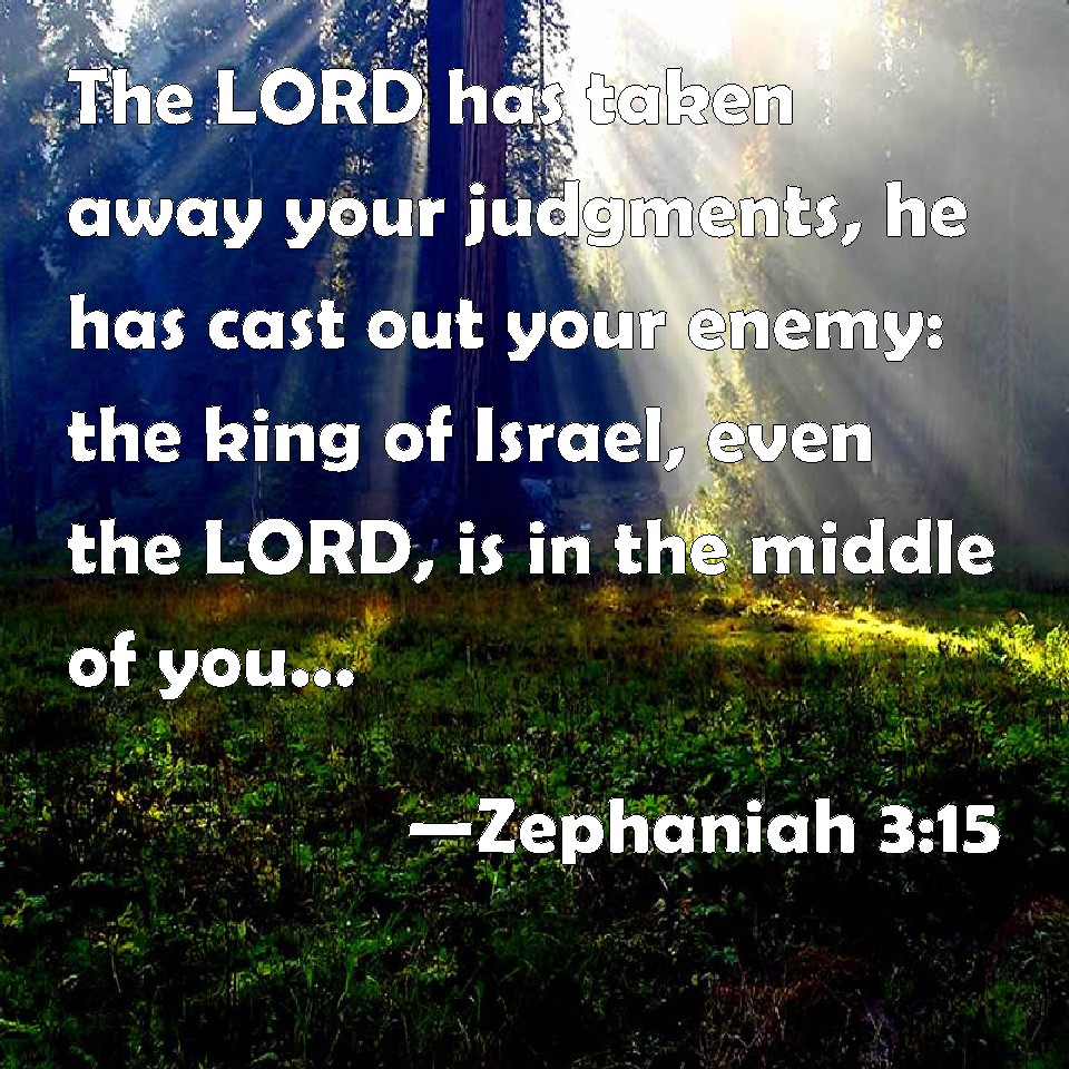 Choose a Background Zephaniah 3:15 The LORD has taken away your judgments, he has cast out your enemy: the king of Israel, even the LORD, is in the middle of you: you shall not see evil any more. KJV: The LORD hath taken away thy judgments, he hath cast out thine enemy: the king of Israel, even the LORD, is in the midst of thee: thou shalt not see evil any more. DRB: The Lord hath taken away thy judgment, he hath turned away thy enemies: the king of Israel the Lord is in the midst of thee, thou shalt fear evil no more. DBT: Jehovah hath taken away thy judgments, he hath cast out thine enemy; the King of Israel, Jehovah, is in the midst of thee; thou shalt not see evil any more. ERV: The LORD hath taken away thy judgments, he hath cast out thine enemy: the king of Israel, even the LORD, is in the midst of thee: thou shalt not fear evil any more. WBT: The LORD hath taken away thy judgments, he hath cast out thy enemy: the King of Israel, even the LORD, is in the midst of thee: thou shalt not see evil any more. WEB: Yahweh has taken away your judgments. He has thrown out your enemy. The King of Israel, Yahweh, is in the midst of you. You will not be afraid of evil any more. YLT: Jehovah hath turned aside thy judgments, He hath faced thine enemy, The king of Israel, Jehovah, is in thy midst, Thou seest evil no more.Links Zephaniah 3:15 NIV • Zephaniah 3:15 NLT • Zephaniah 3:15 ESV • Zephaniah 3:15 NASB • Zephaniah 3:15 KJV • Zephaniah 3:15 Interlinear • Zephaniah 3:15 Commentaries • Zephaniah 3:15 Parallel Texts • Zephaniah 3:15 Bible Apps • Zephaniah 3:15 Parallel • Bible Hub |