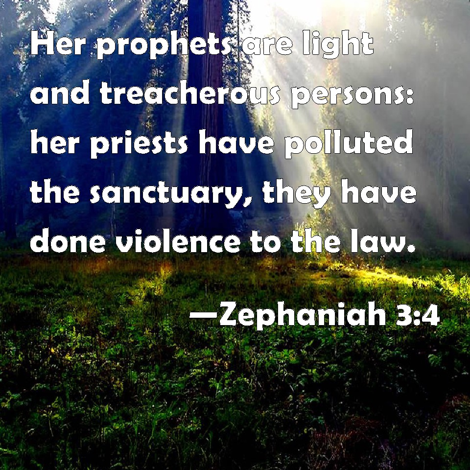 Zephaniah 3:4 Her prophets are light and treacherous persons: her priests have polluted the sanctuary, they have done violence to the law.