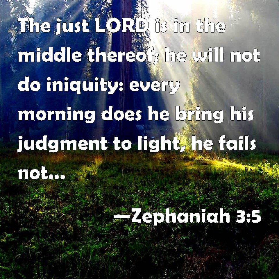 Choose a Background Zephaniah 3:5 The just LORD is in the middle thereof; he will not do iniquity: every morning does he bring his judgment to light, he fails not; but the unjust knows no shame. KJV: The just LORD is in the midst thereof; he will not do iniquity: every morning doth he bring his judgment to light, he faileth not; but the unjust knoweth no shame. DRB: The just Lord is in the midst thereof, he will not do iniquity: in the morning, in the morning he will bring his judgment to light, and it shall not be hid: but the wicked man hath not known shame. DBT: The righteous Jehovah is in the midst of her: he doeth no wrong. Every morning doth he bring his judgment to light; it faileth not: but the unrighteous knoweth no shame. ERV: The LORD in the midst of her is righteous; he will not do iniquity; every morning doth he bring his judgment to light, he faileth not; but the unjust knoweth no shame. WBT: The just LORD is in the midst of her; he will not do iniquity: every morning doth he bring his judgment to light, he faileth not; but the unjust knoweth no shame. WEB: Yahweh, in the midst of her, is righteous. He will do no wrong. Every morning he brings his justice to light. He doesn't fail, but the unjust know no shame. YLT: Jehovah is righteous in her midst, He doth not do perverseness, Morning by morning His judgment he giveth to the light, It hath not been lacking, And the perverse doth not know shame.Links Zephaniah 3:5 NIV • Zephaniah 3:5 NLT • Zephaniah 3:5 ESV • Zephaniah 3:5 NASB • Zephaniah 3:5 KJV • Zephaniah 3:5 Interlinear • Zephaniah 3:5 Commentaries • Zephaniah 3:5 Parallel Texts • Zephaniah 3:5 Bible Apps • Zephaniah 3:5 Parallel • Bible Hub |