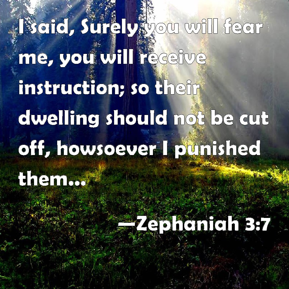 Choose a Background Zephaniah 3:7 I said, Surely you will fear me, you will receive instruction; so their dwelling should not be cut off, howsoever I punished them: but they rose early, and corrupted all their doings. KJV: I said, Surely thou wilt fear me, thou wilt receive instruction; so their dwelling should not be cut off, howsoever I punished them: but they rose early, and corrupted all their doings. DRB: I said: Surely thou wilt fear me, thou wilt receive correction: and her dwelling shall not perish, for all things wherein I have visited her: but they rose early and corrupted all their thoughts. DBT: I said, Only fear me, receive correction; so her dwelling shall not be cut off, howsoever I may punish her. But they rose early, they corrupted all their doings. ERV: I said, Surely thou wilt fear me, thou wilt receive correction; so her dwelling should not be cut off, according to all that I have appointed concerning her: but they rose early and corrupted all their doings. WBT: I said, Surely thou wilt fear me, thou wilt receive instruction; so their dwelling should not be cut off, however I punished them: but they rose early, and corrupted all their doings. WEB: I said, "Just fear me. Receive correction, so that her dwelling won't be cut off, according to all that I have appointed concerning her." But they rose early and corrupted all their doings. YLT: I have said: Only, ye do fear Me, Ye do accept instruction, And her habitation is not cut off, All that I have appointed for her, But they have risen early, They have corrupted all their doings.Links Zephaniah 3:7 NIV • Zephaniah 3:7 NLT • Zephaniah 3:7 ESV • Zephaniah 3:7 NASB • Zephaniah 3:7 KJV • Zephaniah 3:7 Interlinear • Zephaniah 3:7 Commentaries • Zephaniah 3:7 Parallel Texts • Zephaniah 3:7 Bible Apps • Zephaniah 3:7 Parallel • Bible Hub |