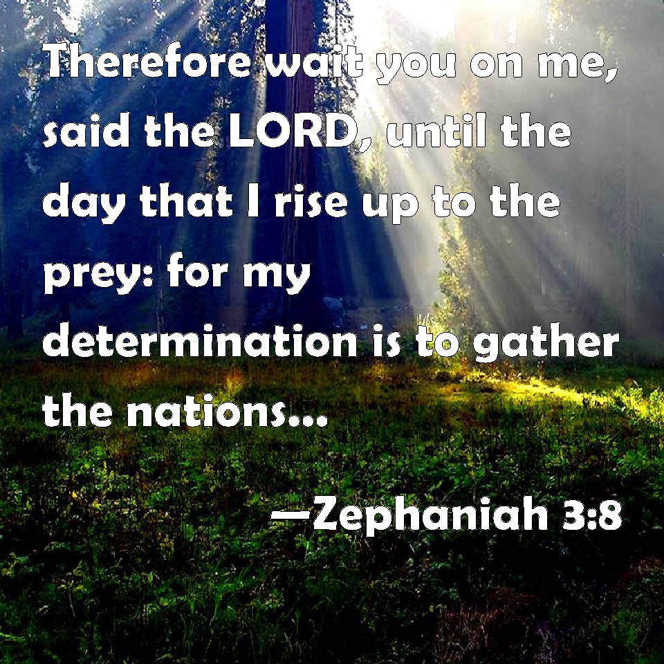 Choose a Background Zephaniah 3:8 Therefore wait you on me, said the LORD, until the day that I rise up to the prey: for my determination is to gather the nations, that I may assemble the kingdoms, to pour on them my indignation, even all my fierce anger: for all the earth shall be devoured with the fire of my jealousy. KJV: Therefore wait ye upon me, saith the LORD, until the day that I rise up to the prey: for my determination is to gather the nations, that I may assemble the kingdoms, to pour upon them mine indignation, even all my fierce anger: for all the earth shall be devoured with the fire of my jealousy. DRB: Wherefore expect me, saith the Lord, in the day of my resurrection that is to come, for my judgment is to assemble the Gentiles, and to gather the kingdoms: and to pour upon them my indignation, all my fierce anger: for with the fire of my jealousy shall all the earth be devoured. DBT: Therefore wait ye for me, saith Jehovah, until the day that I rise up to the prey; for my determination is to assemble the nations, that I may gather the kingdoms together, to pour upon them mine indignation, all my fierce anger: for all the earth shall be devoured with the fire of my jealousy. ERV: Therefore wait ye for me, saith the LORD, until the day that I rise up to the prey: for my determination is to gather the nations, that I may assemble the kingdoms, to pour upon them mine indignation, even all my fierce anger; for all the earth shall be devoured with the fire of my jealousy. WBT: Therefore wait ye upon me, saith the LORD, until the day that I rise up to the prey: for my determination is to gather the nations, that I may assemble the kingdoms, to pour upon them my indignation, even all my fierce anger: for all the earth shall be devoured with the fire of my jealousy. WEB: "Therefore wait for me," says Yahweh, "until the day that I rise up to the prey, for my determination is to gather the nations, that I may assemble the kingdoms, to pour on them my indignation, even all my fierce anger, for all the earth will be devoured with the fire of my jealousy. YLT: Therefore, wait for Me — an affirmation of Jehovah, For the day of My rising for prey, For My judgment is to gather nations, To assemble kingdoms, To pour out on them Mine indignation, All the heat of Mine anger, For by the fire of My jealousy consumed is all the earth.Links Zephaniah 3:8 NIV • Zephaniah 3:8 NLT • Zephaniah 3:8 ESV • Zephaniah 3:8 NASB • Zephaniah 3:8 KJV • Zephaniah 3:8 Interlinear • Zephaniah 3:8 Commentaries • Zephaniah 3:8 Parallel Texts • Zephaniah 3:8 Bible Apps • Zephaniah 3:8 Parallel • Bible Hub |