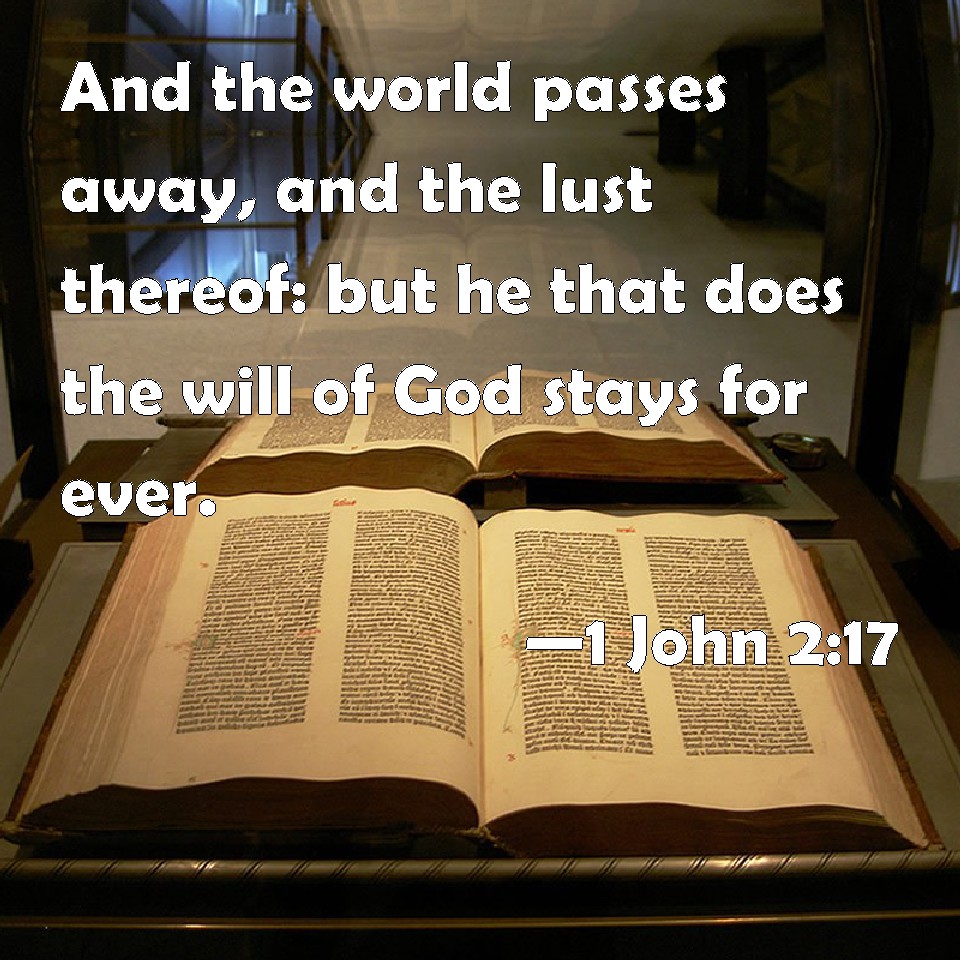 Choose a Background 1 John 2:17 And the world passes away, and the lust thereof: but he that does the will of God stays for ever. KJV: And the world passeth away, and the lust thereof: but he that doeth the will of God abideth for ever. DRB: And the world passeth away, and the concupiscence thereof: but he that doth the will of God, abideth for ever. DBT: And the world is passing, and its lust, but he that does the will of God abides for eternity. ERV: And the world passeth away, and the lust thereof: but he that doeth the will of God abideth for ever. WBT: And the world passeth away, and the lust of it: but he that doeth the will of God abideth for ever. WEB: The world is passing away with its lusts, but he who does God's will remains forever. YLT: and the world doth pass away, and the desire of it, and he who is doing the will of God, he doth remain — to the age.Links 1 John 2:17 NIV • 1 John 2:17 NLT • 1 John 2:17 ESV • 1 John 2:17 NASB • 1 John 2:17 KJV • 1 John 2:17 Interlinear • 1 John 2:17 Commentaries • 1 John 2:17 Parallel Texts • 1 John 2:17 Bible Apps • 1 John 2:17 Parallel • Bible Hub |