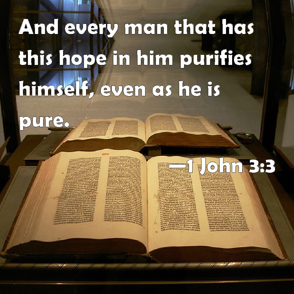 Choose a Background 1 John 3:3 And every man that has this hope in him purifies himself, even as he is pure. KJV: And every man that hath this hope in him purifieth himself, even as he is pure. DRB: And every one that hath this hope in him, sanctifieth himself, as he also is holy. DBT: And every one that has this hope in him purifies himself, even as he is pure. ERV: And every one that hath this hope set on him purifieth himself, even as he is pure. WBT: And every man that hath this hope in him purifieth himself, even as he is pure. WEB: Everyone who has this hope set on him purifies himself, even as he is pure. YLT: and every one who is having this hope on him, doth purify himself, even as he is pure.Links 1 John 3:3 NIV • 1 John 3:3 NLT • 1 John 3:3 ESV • 1 John 3:3 NASB • 1 John 3:3 KJV • 1 John 3:3 Interlinear • 1 John 3:3 Commentaries • 1 John 3:3 Parallel Texts • 1 John 3:3 Bible Apps • 1 John 3:3 Parallel • Bible Hub |