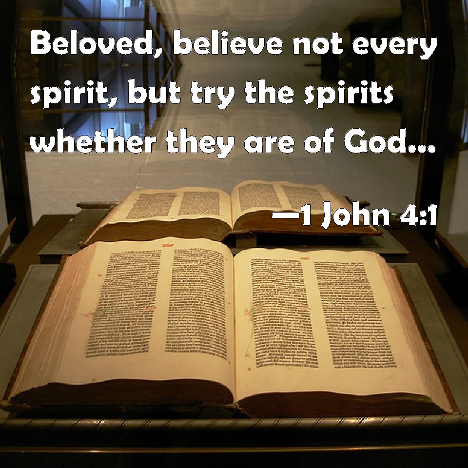 Choose a Background 1 John 4:1 Beloved, believe not every spirit, but try the spirits whether they are of God: because many false prophets are gone out into the world. KJV: Beloved, believe not every spirit, but try the spirits whether they are of God: because many false prophets are gone out into the world. DRB: Dearly beloved, believe not every spirit, but try the spirits if they be of God: because many false prophets are gone out into the world. DBT: Beloved, believe not every spirit, but prove the spirits, if they are of God; because many false prophets are gone out into the world. ERV: Beloved, believe not every spirit, but prove the spirits, whether they are of God: because many false prophets are gone out into the world. WBT: Beloved, believe not every spirit, but try the spirits whether they are of God: because many false prophets have gone out into the world. WEB: Beloved, don't believe every spirit, but test the spirits, whether they are of God, because many false prophets have gone out into the world. YLT: Beloved, every spirit believe not, but prove the spirits, if of God they are, because many false prophets have gone forth to the world;Links 1 John 4:1 NIV • 1 John 4:1 NLT • 1 John 4:1 ESV • 1 John 4:1 NASB • 1 John 4:1 KJV • 1 John 4:1 Interlinear • 1 John 4:1 Commentaries • 1 John 4:1 Parallel Texts • 1 John 4:1 Bible Apps • 1 John 4:1 Parallel • Bible Hub |