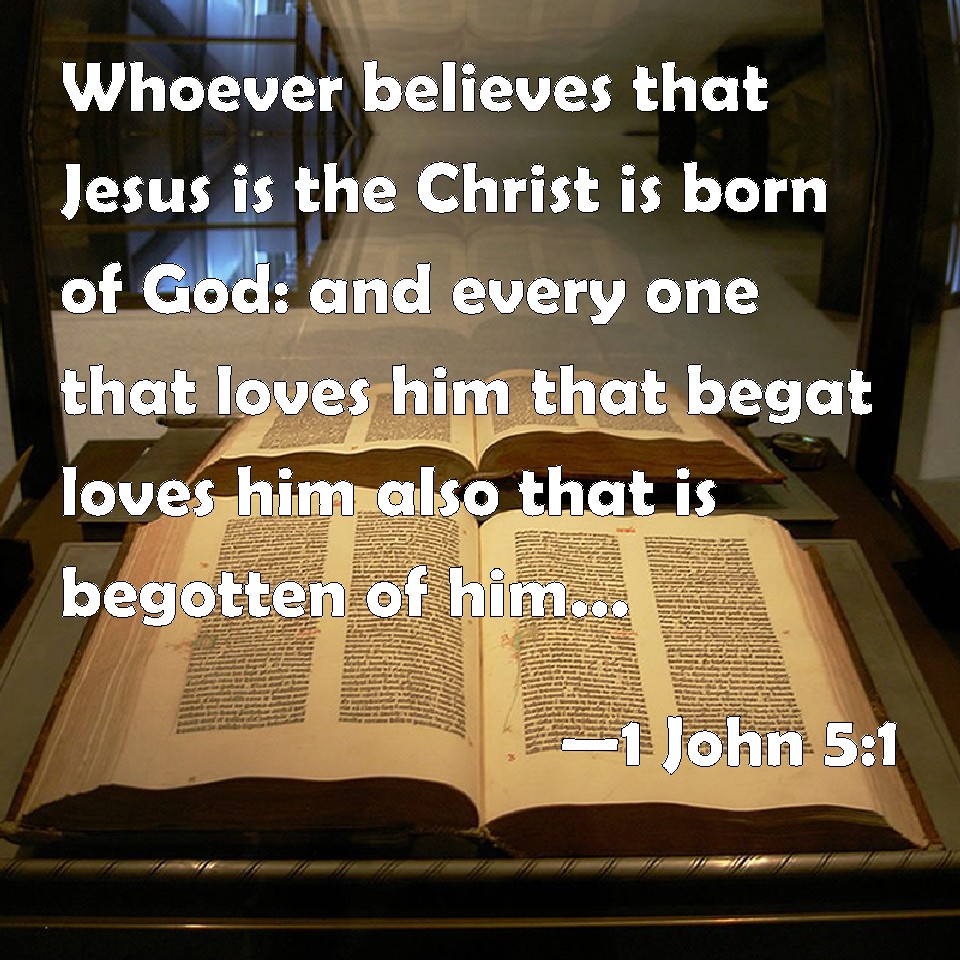 1 John 5:1 Whoever believes that Jesus is the Christ is born of God: and every one that loves him that begat loves him also that is begotten of him.