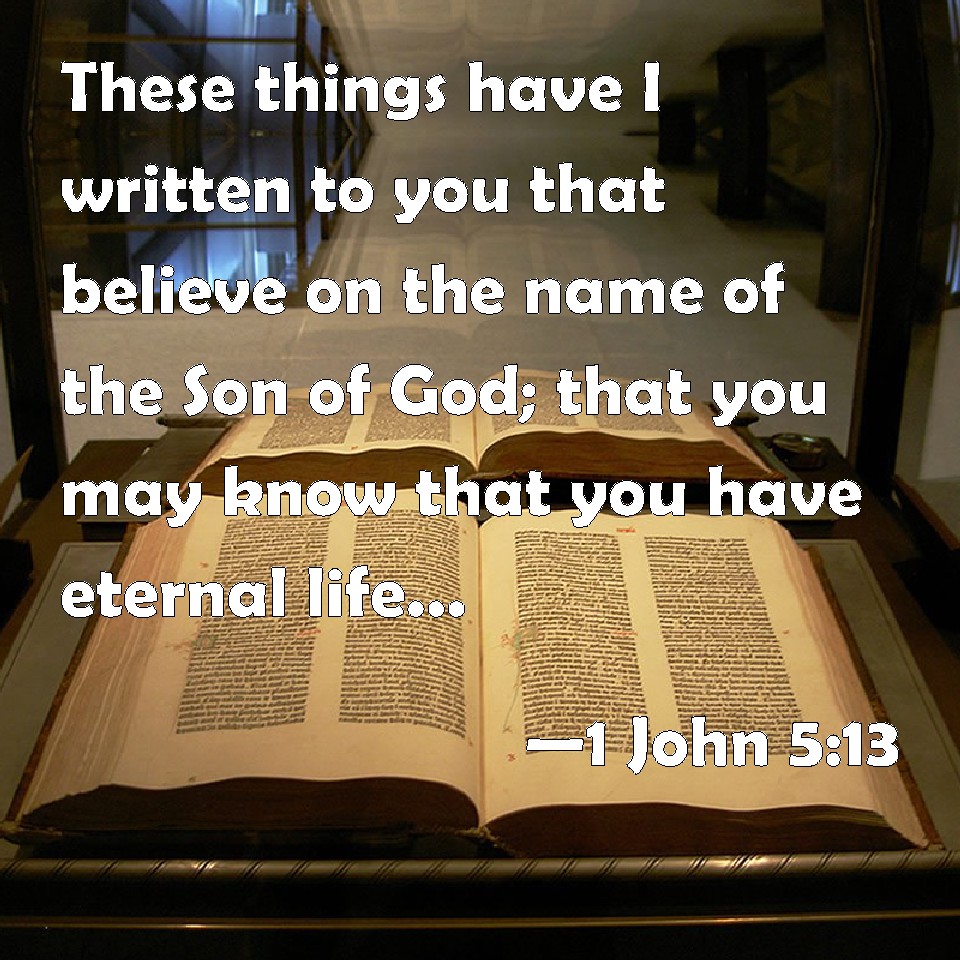 Choose a Background 1 John 5:13 These things have I written to you that believe on the name of the Son of God; that you may know that you have eternal life, and that you may believe on the name of the Son of God. KJV: These things have I written unto you that believe on the name of the Son of God; that ye may know that ye have eternal life, and that ye may believe on the name of the Son of God. DRB: These things I write to you, that you may know that you have eternal life, you who believe in the name of the Son of God. DBT: These things have I written to you that ye may know that ye have eternal life who believe on the name of the Son of God. ERV: These things have I written unto you, that ye may know that ye have eternal life, even unto you that believe on the name of the Son of God. WBT: These things have I written to you that believe on the name of the Son of God; that ye may know that ye have eternal life, and that ye may believe on the name of the Son of God. WEB: These things I have written to you who believe in the name of the Son of God, that you may know that you have eternal life, and that you may continue to believe in the name of the Son of God. YLT: These things I did write to you who are believing in the name of the Son of God, that ye may know that life ye have age-during, and that ye may believe in the name of the Son of God.Links 1 John 5:13 NIV • 1 John 5:13 NLT • 1 John 5:13 ESV • 1 John 5:13 NASB • 1 John 5:13 KJV • 1 John 5:13 Interlinear • 1 John 5:13 Commentaries • 1 John 5:13 Parallel Texts • 1 John 5:13 Bible Apps • 1 John 5:13 Parallel • Bible Hub |