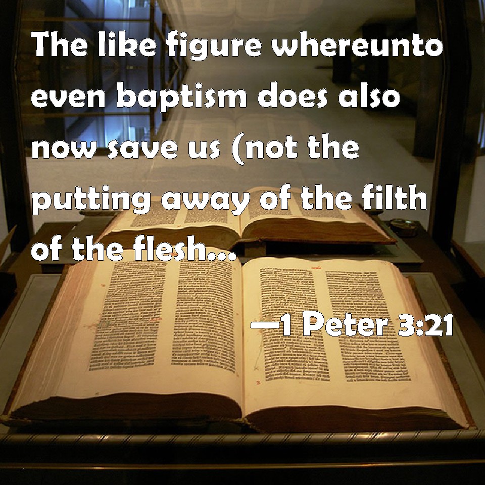 Choose a Background 1 Peter 3:21 The like figure whereunto even baptism does also now save us (not the putting away of the filth of the flesh, but the answer of a good conscience toward God,) by the resurrection of Jesus Christ: KJV: The like figure whereunto even baptism doth also now save us (not the putting away of the filth of the flesh, but the answer of a good conscience toward God,) by the resurrection of Jesus Christ: DRB: Whereunto baptism being of the like form, now saveth you also: not the putting away of the filth of the flesh, but the examination of a good conscience towards God by the resurrection of Jesus Christ. DBT: which figure also now saves you, even baptism, not a putting away of the filth of flesh, but the demand as before God of a good conscience, by the resurrection of Jesus Christ, ERV: which also after a true likeness doth now save you, even baptism, not the putting away of the filth of the flesh, but the interrogation of a good conscience toward God, through the resurrection of Jesus Christ; WBT: The like figure to which, even baptism, doth also now save us (not the putting away of the filth of the flesh, but the answer of a good conscience towards God,) by the resurrection of Jesus Christ: WEB: This is a symbol of baptism, which now saves you—not the putting away of the filth of the flesh, but the answer of a good conscience toward God, through the resurrection of Jesus Christ, YLT: also to which an antitype doth now save us — baptism, (not a putting away of the filth of flesh, but the question of a good conscience in regard to God,) through the rising again of Jesus Christ,Links 1 Peter 3:21 NIV • 1 Peter 3:21 NLT • 1 Peter 3:21 ESV • 1 Peter 3:21 NASB • 1 Peter 3:21 KJV • 1 Peter 3:21 Interlinear • 1 Peter 3:21 Commentaries • 1 Peter 3:21 Parallel Texts • 1 Peter 3:21 Bible Apps • 1 Peter 3:21 Parallel • Bible Hub |