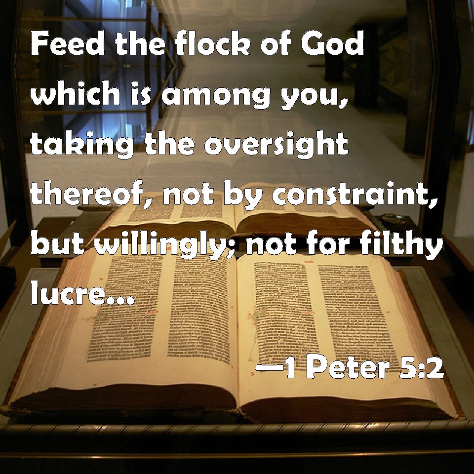 Choose a Background 1 Peter 5:2 Feed the flock of God which is among you, taking the oversight thereof, not by constraint, but willingly; not for filthy lucre, but of a ready mind; KJV: Feed the flock of God which is among you, taking the oversight thereof, not by constraint, but willingly; not for filthy lucre, but of a ready mind; DRB: Feed the flock of God which is among you, taking care of it, not by constraint, but willingly, according to God: not for filthy lucre's sake, but voluntarily: DBT: shepherd the flock of God which is among you, exercising oversight, not by necessity, but willingly; not for base gain, but readily; ERV: Tend the flock of God which is among you, exercising the oversight, not of constraint, but willingly, according unto God; nor yet for filthy lucre, but of a ready mind; WBT: Feed the flock of God which is among you, taking the oversight of it, not by constraint, but willingly; not for filthy lucre, but from a ready mind; WEB: Shepherd the flock of God which is among you, exercising the oversight, not under compulsion, but voluntarily, not for dishonest gain, but willingly; YLT: feed the flock of God that is among you, overseeing not constrainedly, but willingly, neither for filthy lucre, but of a ready mind,Links 1 Peter 5:2 NIV • 1 Peter 5:2 NLT • 1 Peter 5:2 ESV • 1 Peter 5:2 NASB • 1 Peter 5:2 KJV • 1 Peter 5:2 Interlinear • 1 Peter 5:2 Commentaries • 1 Peter 5:2 Parallel Texts • 1 Peter 5:2 Bible Apps • 1 Peter 5:2 Parallel • Bible Hub |
