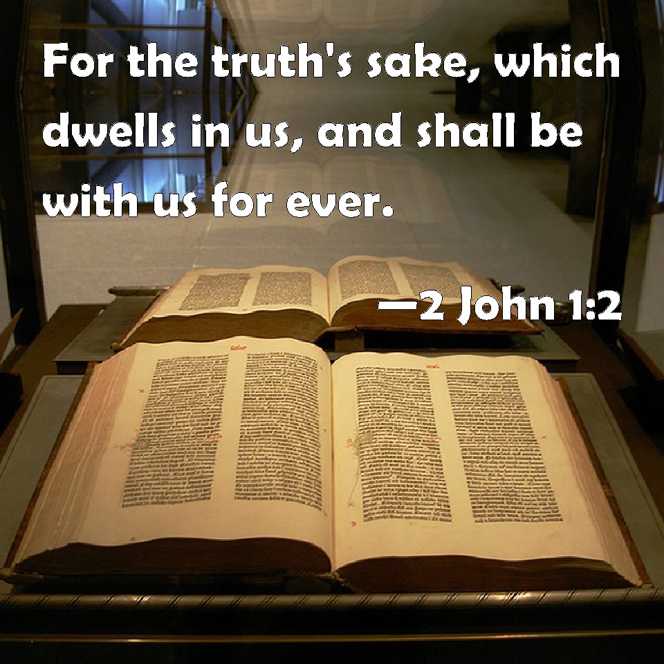 Choose a Background 2 John 1:2 For the truth's sake, which dwells in us, and shall be with us for ever. KJV: For the truth's sake, which dwelleth in us, and shall be with us for ever. DRB: For the sake of the truth which dwelleth in us, and shall be with us for ever. DBT: for the truth's sake which abides in us and shall be with us to eternity. ERV: for the truth's sake which abideth in us, and it shall be with us for ever: WBT: For the truth's sake which dwelleth in us, and shall be with us for ever. WEB: for the truth's sake, which remains in us, and it will be with us forever: YLT: because of the truth that is remaining in us, and with us shall be to the age,Links 2 John 1:2 NIV • 2 John 1:2 NLT • 2 John 1:2 ESV • 2 John 1:2 NASB • 2 John 1:2 KJV • 2 John 1:2 Interlinear • 2 John 1:2 Commentaries • 2 John 1:2 Parallel Texts • 2 John 1:2 Bible Apps • 2 John 1:2 Parallel • Bible Hub |