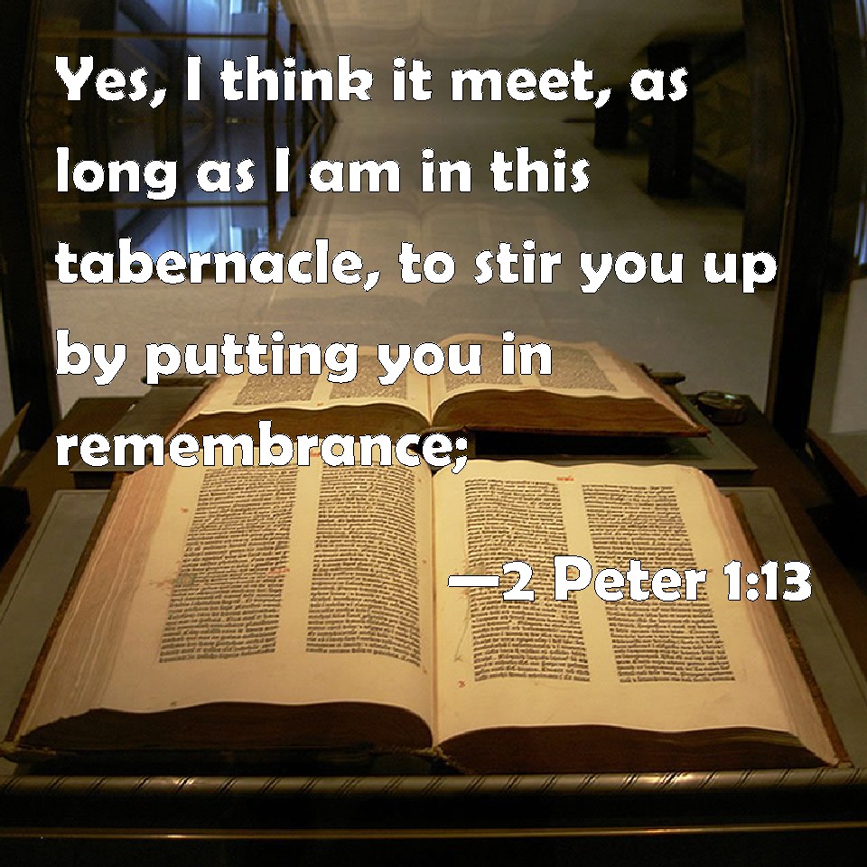 Choose a Background 2 Peter 1:13 Yes, I think it meet, as long as I am in this tabernacle, to stir you up by putting you in remembrance; KJV: Yea, I think it meet, as long as I am in this tabernacle, to stir you up by putting you in remembrance; DRB: But I think it meet as long as I am in this tabernacle, to stir you up by putting you in remembrance. DBT: But I account it right, as long as I am in this tabernacle, to stir you up by putting you in remembrance, ERV: And I think it right, as long as I am in this tabernacle, to stir you up by putting you in remembrance; WBT: Indeed, I think it meet, as long as I am in this tabernacle, to stir you up by putting you in remembrance; WEB: I think it right, as long as I am in this tent, to stir you up by reminding you; YLT: and I think right, so long as I am in this tabernacle, to stir you up in reminding you,Links 2 Peter 1:13 NIV • 2 Peter 1:13 NLT • 2 Peter 1:13 ESV • 2 Peter 1:13 NASB • 2 Peter 1:13 KJV • 2 Peter 1:13 Interlinear • 2 Peter 1:13 Commentaries • 2 Peter 1:13 Parallel Texts • 2 Peter 1:13 Bible Apps • 2 Peter 1:13 Parallel • Bible Hub |