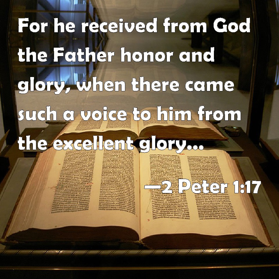 Choose a Background 2 Peter 1:17 For he received from God the Father honor and glory, when there came such a voice to him from the excellent glory, This is my beloved Son, in whom I am well pleased. KJV: For he received from God the Father honour and glory, when there came such a voice to him from the excellent glory, This is my beloved Son, in whom I am well pleased. DRB: For he received from God the Father, honour and glory: this voice coming down to him from the excellent glory: This is my beloved Son, in whom I am well pleased; hear ye him. DBT: For he received from God the Father honour and glory, such a voice being uttered to him by the excellent glory: This is my beloved Son, in whom I have found my delight; ERV: For he received from God the Father honour and glory, when there came such a voice to him from the excellent glory, This is my beloved Son, in whom I am well pleased: WBT: For he received from God the Father honor and glory, when there came such a voice to him from the excellent glory, This is my beloved Son, in whom I am well pleased. WEB: For he received from God the Father honor and glory, when the voice came to him from the Majestic Glory, "This is my beloved Son, in whom I am well pleased." YLT: for having received from God the Father honour and glory, such a voice being borne to him by the excellent glory: 'This is My Son — the beloved, in whom I was well pleased;'Links 2 Peter 1:17 NIV • 2 Peter 1:17 NLT • 2 Peter 1:17 ESV • 2 Peter 1:17 NASB • 2 Peter 1:17 KJV • 2 Peter 1:17 Interlinear • 2 Peter 1:17 Commentaries • 2 Peter 1:17 Parallel Texts • 2 Peter 1:17 Bible Apps • 2 Peter 1:17 Parallel • Bible Hub |
