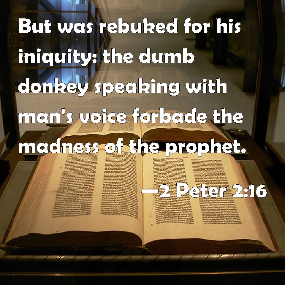2 Peter 2:16 But was rebuked for his iniquity: the dumb ass speaking with man's voice forbade the madness of the prophet.