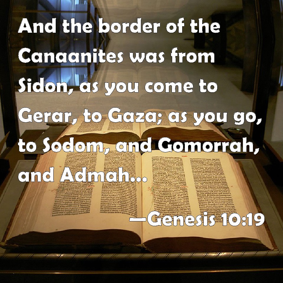 Choose a Background Genesis 10:19 And the border of the Canaanites was from Sidon, as you come to Gerar, to Gaza; as you go, to Sodom, and Gomorrah, and Admah, and Zeboim, even to Lasha. KJV: And the border of the Canaanites was from Sidon, as thou comest to Gerar, unto Gaza; as thou goest, unto Sodom, and Gomorrah, and Admah, and Zeboim, even unto Lasha. DRB: And the limits of Chanaan were from Sidon as one comes to Gerara even to Gaza, until thou enter Sodom and Gomorrha, and Adama, and Seboim even to Lesa. DBT: And the border of the Canaanite was from Sidon, as one goes to Gerar, up to Gazah; as one goes to Sodom, and Gomorrah, and Admah, and Zeboim, up to Lesha. ERV: And the border of the Canaanite was from Zidon, as thou goest toward Gerar, unto Gaza; as thou goest toward Sodom and Gomorrah and Admah and Zeboiim, unto Lasha. WBT: And the border of the Canaanites was from Sidon, as thou comest to Gerar, to Gaza; as thou goest to Sodom and Gomorrah, and Admah, and Zeboim, even to Lashah. WEB: The border of the Canaanites was from Sidon, as you go toward Gerar, to Gaza; as you go toward Sodom, Gomorrah, Admah, and Zeboiim, to Lasha. YLT: And the border of the Canaanite is from Sidon, in thy coming towards Gerar, unto Gaza; in thy coming towards Sodom, and Gomorrah, and Admah, and Zeboim, unto Lasha.Links Genesis 10:19 NIV • Genesis 10:19 NLT • Genesis 10:19 ESV • Genesis 10:19 NASB • Genesis 10:19 KJV • Genesis 10:19 Interlinear • Genesis 10:19 Commentaries • Genesis 10:19 Parallel Texts • Genesis 10:19 Bible Apps • Genesis 10:19 Parallel • Bible Hub |