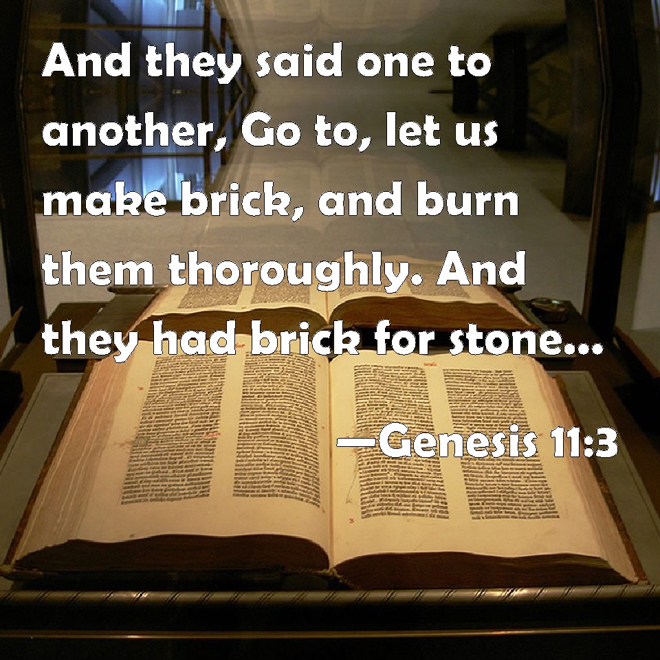 Choose a Background Genesis 11:3 And they said one to another, Go to, let us make brick, and burn them thoroughly. And they had brick for stone, and slime had they for mortar. KJV: And they said one to another, Go to, let us make brick, and burn them throughly. And they had brick for stone, and slime had they for morter. DRB: And each one said to his neighbour: Come, let us make brick, and bake them of stones, and slime instead of mortar. DBT: And they said one to another, Come on, let us make bricks, and burn them thoroughly. And they had brick for stone, and they had asphalt for mortar. ERV: And they said one to another, Go to, let us make brick, and burn them throughly. And they had brick for stone, and slime had they for mortar. WBT: And they said one to another, come, let us make brick, and burn them thoroughly. And they had brick for stone, and slime had they for mortar. WEB: They said one to another, "Come, let's make bricks, and burn them thoroughly." They had brick for stone, and they used tar for mortar. YLT: and they say each one to his neighbour, 'Give help, let us make bricks, and burn them thoroughly:' and the brick is to them for stone, and the bitumen hath been to them for mortar.Links Genesis 11:3 NIV • Genesis 11:3 NLT • Genesis 11:3 ESV • Genesis 11:3 NASB • Genesis 11:3 KJV • Genesis 11:3 Interlinear • Genesis 11:3 Commentaries • Genesis 11:3 Parallel Texts • Genesis 11:3 Bible Apps • Genesis 11:3 Parallel • Bible Hub |
