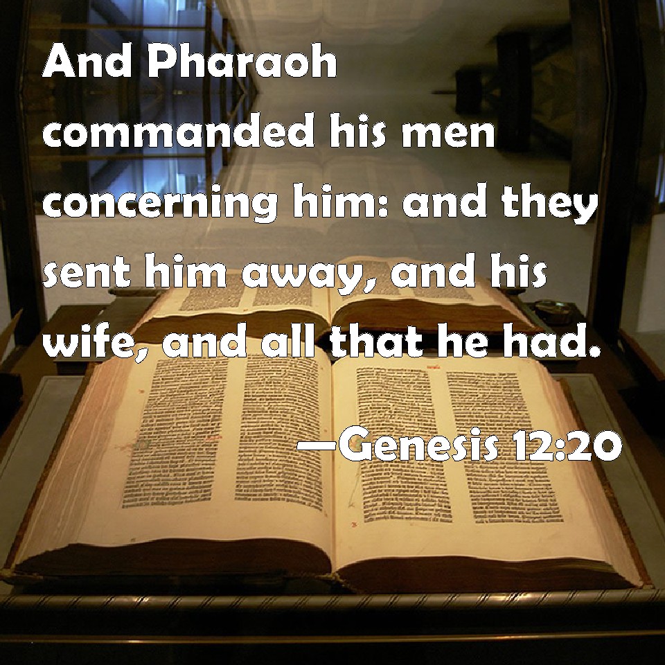 Choose a Background Genesis 12:20 And Pharaoh commanded his men concerning him: and they sent him away, and his wife, and all that he had. KJV: And Pharaoh commanded his men concerning him: and they sent him away, and his wife, and all that he had. DRB: And Pharao gave his men orders concerning Abram: and they led him away, and his wife, and all that he had. DBT: And Pharaoh commanded his men concerning him, and they sent him away, and his wife, and all that he had. ERV: And Pharaoh gave men charge concerning him: and they brought him on the way, and his wife, and all that he had. WBT: And Pharaoh commanded his men concerning him: and they sent him away, and his wife, and all that he had. WEB: Pharaoh commanded men concerning him, and they brought him on the way with his wife and all that he had. YLT: And Pharaoh chargeth men concerning him, and they send him away, and his wife, an all that he hath.Links Genesis 12:20 NIV • Genesis 12:20 NLT • Genesis 12:20 ESV • Genesis 12:20 NASB • Genesis 12:20 KJV • Genesis 12:20 Interlinear • Genesis 12:20 Commentaries • Genesis 12:20 Parallel Texts • Genesis 12:20 Bible Apps • Genesis 12:20 Parallel • Bible Hub |