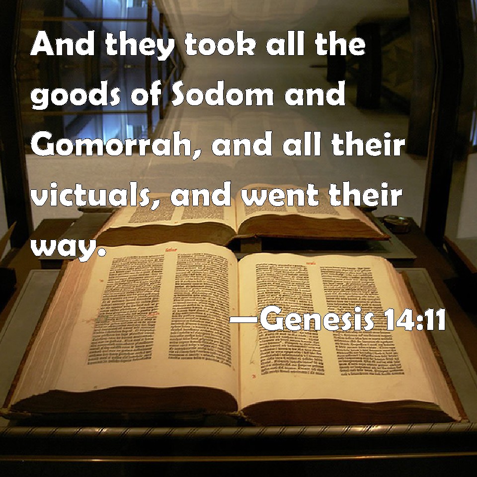 Choose a Background Genesis 14:11 And they took all the goods of Sodom and Gomorrah, and all their victuals, and went their way. KJV: And they took all the goods of Sodom and Gomorrah, and all their victuals, and went their way. DRB: And they took all the substance of the Sodomites, and Gomorrhites, and all their victuals, and went their way: DBT: And they took all the property of Sodom and Gomorrah, and all their victuals, and departed. ERV: And they took all the goods of Sodom and Gomorrah, and all their victuals, and went their way. WBT: And they took all the goods of Sodom and Gomorrah, and all their provisions, and went their way. WEB: They took all the goods of Sodom and Gomorrah, and all their food, and went their way. YLT: And they take the whole substance of Sodom and Gomorrah, and the whole of their food, and go away;Links Genesis 14:11 NIV • Genesis 14:11 NLT • Genesis 14:11 ESV • Genesis 14:11 NASB • Genesis 14:11 KJV • Genesis 14:11 Interlinear • Genesis 14:11 Commentaries • Genesis 14:11 Parallel Texts • Genesis 14:11 Bible Apps • Genesis 14:11 Parallel • Bible Hub |