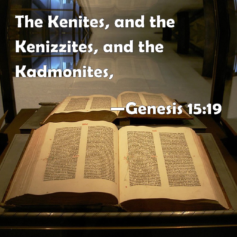 Choose a Background Genesis 15:19 The Kenites, and the Kenizzites, and the Kadmonites, KJV: The Kenites, and the Kenizzites, and the Kadmonites, DRB: The Cineans and Cenezites, the Cedmonites, DBT: the Kenites, and the Kenizzites, and the Kadmonites, ERV: the Kenite, and the Kenizzite, and the Kadmonite, WBT: The Kenites, and the Kenizzites, and the Kadmonites, WEB: the Kenites, the Kenizzites, the Kadmonites, YLT: with the Kenite, and the Kenizzite, and the Kadmonite,Links Genesis 15:19 NIV • Genesis 15:19 NLT • Genesis 15:19 ESV • Genesis 15:19 NASB • Genesis 15:19 KJV • Genesis 15:19 Interlinear • Genesis 15:19 Commentaries • Genesis 15:19 Parallel Texts • Genesis 15:19 Bible Apps • Genesis 15:19 Parallel • Bible Hub |