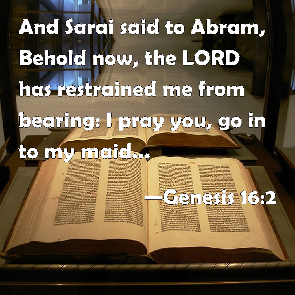 Choose a Background Genesis 16:2 And Sarai said to Abram, Behold now, the LORD has restrained me from bearing: I pray you, go in to my maid; it may be that I may obtain children by her. And Abram listened to the voice of Sarai. KJV: And Sarai said unto Abram, Behold now, the LORD hath restrained me from bearing: I pray thee, go in unto my maid; it may be that I may obtain children by her. And Abram hearkened to the voice of Sarai. DRB: She said to her husband: Behold, the Lord hath restrained me from bearing: go in unto my handmaid, it may be I may have children of her at least. And when he agreed to her request, DBT: And Sarai said to Abram, Behold now, Jehovah has shut me up, that I do not bear. Go in, I pray thee, to my maidservant: it may be that I shall be built up by her. And Abram hearkened to the voice of Sarai. ERV: And Sarai said unto Abram, Behold now, the LORD hath restrained me from bearing; go in, I pray thee, unto my handmaid; it may be that I shall obtain children by her. And Abram hearkened to the voice of Sarai. WBT: And Sarai said to Abram, Behold, now, the LORD hath restrained me from bearing: I pray thee go in to my maid; it may be that I may obtain children by her. And Abram hearkened to the voice of Sarai. WEB: Sarai said to Abram, "See now, Yahweh has restrained me from bearing. Please go in to my handmaid. It may be that I will obtain children by her." Abram listened to the voice of Sarai. YLT: and Sarai saith unto Abram, 'Lo, I pray thee, Jehovah hath restrained me from bearing, go in, I pray thee, unto my handmaid; perhaps I am built up from her;' and Abram hearkeneth to the voice of Sarai.Links Genesis 16:2 NIV • Genesis 16:2 NLT • Genesis 16:2 ESV • Genesis 16:2 NASB • Genesis 16:2 KJV • Genesis 16:2 Interlinear • Genesis 16:2 Commentaries • Genesis 16:2 Parallel Texts • Genesis 16:2 Bible Apps • Genesis 16:2 Parallel • Bible Hub |