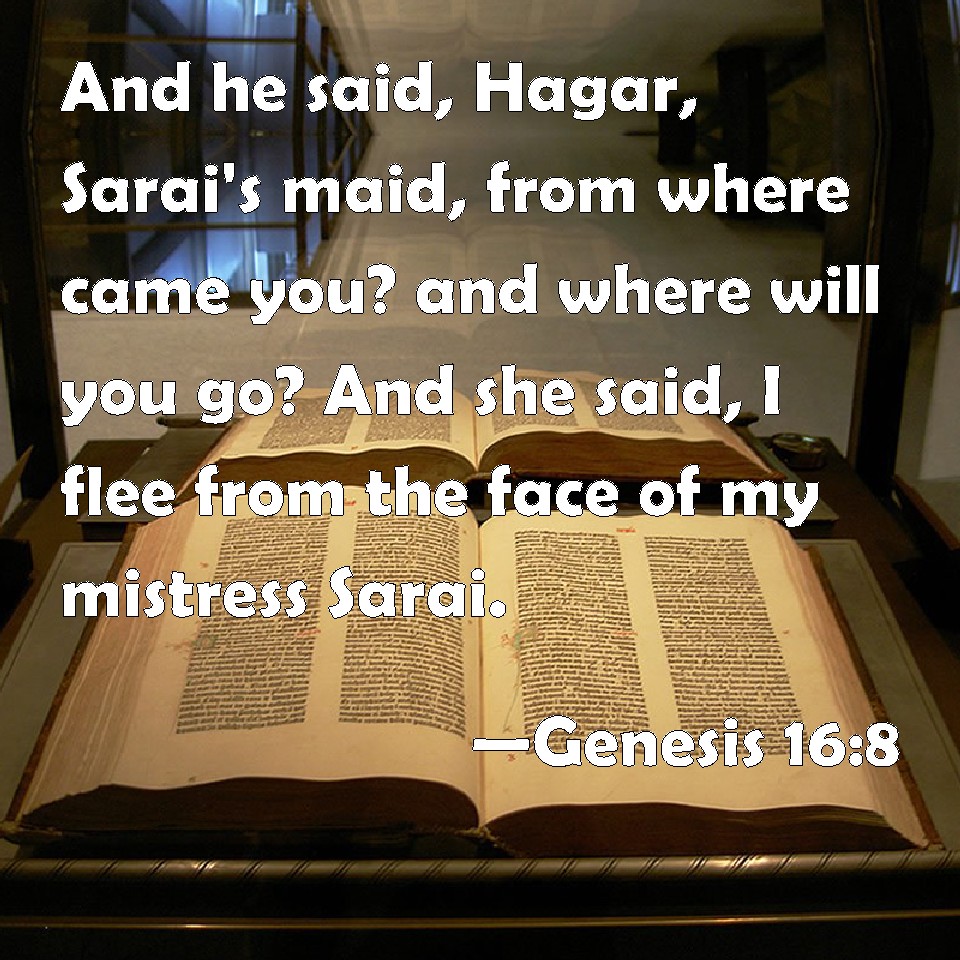 Choose a Background Genesis 16:8 And he said, Hagar, Sarai's maid, from where came you? and where will you go? And she said, I flee from the face of my mistress Sarai. KJV: And he said, Hagar, Sarai's maid, whence camest thou? and whither wilt thou go? And she said, I flee from the face of my mistress Sarai. DRB: He said to her: Agar, handmaid of Sarai, whence comest thou? and whither goest thou? And she answered: I flee from the face of Sarai, my mistress. DBT: And he said, Hagar, Sarai's maidservant, whence comest thou? and whither art thou going? And she said, I am fleeing from the face of my mistress Sarai. ERV: And he said, Hagar, Sarai's handmaid, whence camest thou? and whither goest thou? And she said, I flee from the face of my mistress Sarai. WBT: And he said, Hagar, Sarai's maid, whence camest thou? and whither wilt thou go? And she said, I flee from the face of my mistress Sarai. WEB: He said, "Hagar, Sarai's handmaid, where did you come from? Where are you going?" She said, "I am fleeing from the face of my mistress Sarai." YLT: and he saith, 'Hagar, Sarai's handmaid, whence hast thou come, and whither dost thou go?' and she saith, 'From the presence of Sarai, my mistress, I am fleeing.'Links Genesis 16:8 NIV • Genesis 16:8 NLT • Genesis 16:8 ESV • Genesis 16:8 NASB • Genesis 16:8 KJV • Genesis 16:8 Interlinear • Genesis 16:8 Commentaries • Genesis 16:8 Parallel Texts • Genesis 16:8 Bible Apps • Genesis 16:8 Parallel • Bible Hub |