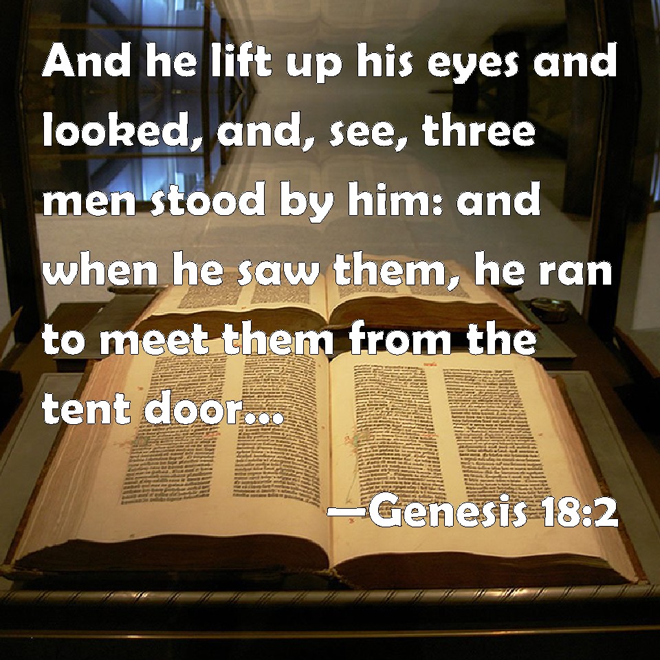 Choose a Background Genesis 18:2 And he lift up his eyes and looked, and, see, three men stood by him: and when he saw them, he ran to meet them from the tent door, and bowed himself toward the ground, KJV: And he lift up his eyes and looked, and, lo, three men stood by him: and when he saw them, he ran to meet them from the tent door, and bowed himself toward the ground, DRB: And when he had lifted up his eyes, there appeared to him three men standing near him: and as soon as he saw them he ran to meet them from the door of his tent, and adored down to the ground. DBT: And he lifted up his eyes and saw, and behold, three men standing near him. And when he saw them, he ran to meet them from the tent-door, and bowed himself to the earth, ERV: and he lift up his eyes and looked, and, lo, three men stood over against him: and when he saw them, he ran to meet them from the tent door, and bowed himself to the earth, WBT: And he lifted up his eyes and looked, and lo, three men stood by him: and when he saw them, he ran to meet them from the tent door, and bowed himself toward the ground, WEB: He lifted up his eyes and looked, and saw that three men stood opposite him. When he saw them, he ran to meet them from the tent door, and bowed himself to the earth, YLT: and he lifteth up his eyes and looketh, and lo, three men standing by him, and he seeth, and runneth to meet them from the opening of the tent, and boweth himself towards the earth,Links Genesis 18:2 NIV • Genesis 18:2 NLT • Genesis 18:2 ESV • Genesis 18:2 NASB • Genesis 18:2 KJV • Genesis 18:2 Interlinear • Genesis 18:2 Commentaries • Genesis 18:2 Parallel Texts • Genesis 18:2 Bible Apps • Genesis 18:2 Parallel • Bible Hub |