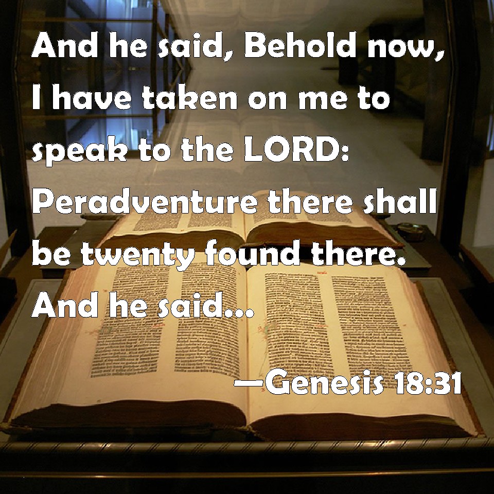 Choose a Background Genesis 18:31 And he said, Behold now, I have taken on me to speak to the LORD: Peradventure there shall be twenty found there. And he said, I will not destroy it for twenty's sake. KJV: And he said, Behold now, I have taken upon me to speak unto the Lord: Peradventure there shall be twenty found there. And he said, I will not destroy it for twenty's sake. DRB: Seeing, saith he, I have once begun, I will speak to my Lord. What if twenty be found there? He said: I will not destroy it for the sake of twenty. DBT: And he said, Behold now, I have ventured to speak with the Lord. Perhaps there may be twenty found there. And he said, I will not destroy it for the twenty's sake. ERV: And he said, Behold now, I have taken upon me to speak unto the Lord: peradventure there shall be twenty found there. And he said, I will not destroy it for the twenty's sake. WBT: And he said, Behold now, I have taken upon me to speak to the Lord: Peradventure there will be twenty found there. And he said, I will not destroy it for twenty's sake. WEB: He said, "See now, I have taken it on myself to speak to the Lord. What if there are twenty found there?" He said, "I will not destroy it for the twenty's sake." YLT: And he saith, 'Lo, I pray thee, I have willed to speak unto the Lord: peradventure there are found there twenty?' and He saith, 'I do not destroy it, because of the twenty.'Links Genesis 18:31 NIV • Genesis 18:31 NLT • Genesis 18:31 ESV • Genesis 18:31 NASB • Genesis 18:31 KJV • Genesis 18:31 Interlinear • Genesis 18:31 Commentaries • Genesis 18:31 Parallel Texts • Genesis 18:31 Bible Apps • Genesis 18:31 Parallel • Bible Hub |