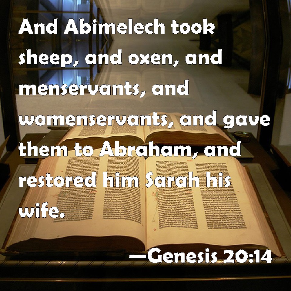 Choose a Background Genesis 20:14 And Abimelech took sheep, and oxen, and menservants, and womenservants, and gave them to Abraham, and restored him Sarah his wife. KJV: And Abimelech took sheep, and oxen, and menservants, and womenservants, and gave them unto Abraham, and restored him Sarah his wife. DRB: And Abimelech took sheep and oxen, and servants and handmaids, and gave to Abraham: and restored to him Sara, his wife. DBT: And Abimelech took sheep and oxen, and bondmen and bondwomen, and gave them to Abraham, and restored him Sarah his wife. ERV: And Abimelech took sheep and oxen, and menservants and womenservants, and gave them unto Abraham, and restored him Sarah his wife. WBT: And Abimelech took sheep, and oxen, and men-servants, and women-servants, and gave them to Abraham, and restored to him Sarah his wife. WEB: Abimelech took sheep and cattle, male servants and female servants, and gave them to Abraham, and restored Sarah, his wife, to him. YLT: And Abimelech taketh sheep and oxen, and servants and handmaids, and giveth to Abraham, and sendeth back to him Sarah his wife;Links Genesis 20:14 NIV • Genesis 20:14 NLT • Genesis 20:14 ESV • Genesis 20:14 NASB • Genesis 20:14 KJV • Genesis 20:14 Interlinear • Genesis 20:14 Commentaries • Genesis 20:14 Parallel Texts • Genesis 20:14 Bible Apps • Genesis 20:14 Parallel • Bible Hub |