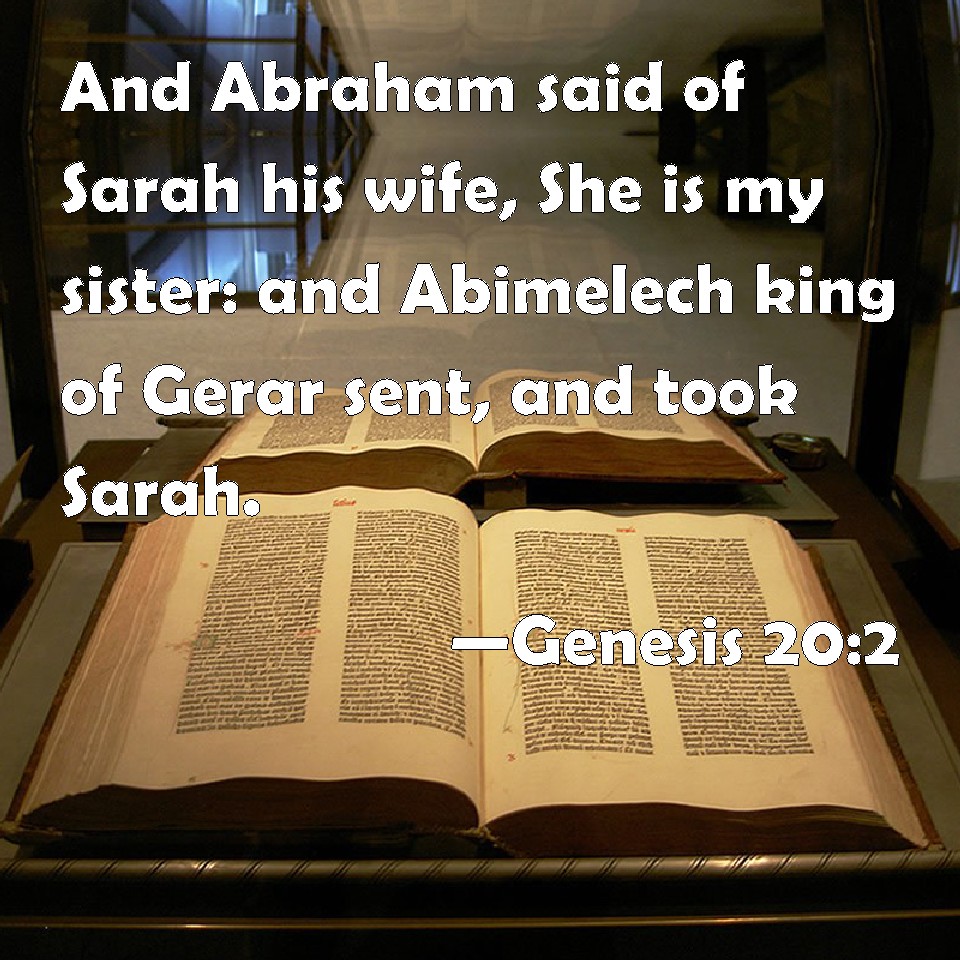 Choose a Background Genesis 20:2 And Abraham said of Sarah his wife, She is my sister: and Abimelech king of Gerar sent, and took Sarah. KJV: And Abraham said of Sarah his wife, She is my sister: and Abimelech king of Gerar sent, and took Sarah. DRB: And he said of Sara his wife: She is my sister. So Abimelech the king of Oerara sent, and took her. DBT: And Abraham said of Sarah his wife, She is my sister. And Abimelech the king of Gerar sent and took Sarah. ERV: And Abraham said of Sarah his wife, She is my sister: and Abimelech king of Gerar sent, and took Sarah. WBT: And Abraham said of Sarah his wife, she is my sister: And Abimelech king of Gerar sent and took Sarah. WEB: Abraham said about Sarah his wife, "She is my sister." Abimelech king of Gerar sent, and took Sarah. YLT: and Abraham saith concerning Sarah his wife, 'She is my sister;' and Abimelech king of Gerar sendeth and taketh Sarah.Links Genesis 20:2 NIV • Genesis 20:2 NLT • Genesis 20:2 ESV • Genesis 20:2 NASB • Genesis 20:2 KJV • Genesis 20:2 Interlinear • Genesis 20:2 Commentaries • Genesis 20:2 Parallel Texts • Genesis 20:2 Bible Apps • Genesis 20:2 Parallel • Bible Hub |