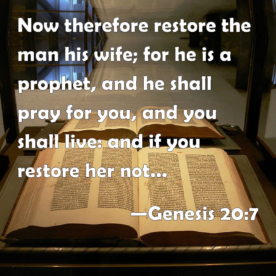 Choose a Background Genesis 20:7 Now therefore restore the man his wife; for he is a prophet, and he shall pray for you, and you shall live: and if you restore her not, know you that you shall surely die, you, and all that are yours. KJV: Now therefore restore the man his wife; for he is a prophet, and he shall pray for thee, and thou shalt live: and if thou restore her not, know thou that thou shalt surely die, thou, and all that are thine. DRB: Now therefore restore the man his wife, for he is a prophet: and he shall pray for thee, and thou shalt live: but if thou wilt not restore her, know that thou shalt surely die, thou and all that are thins. DBT: And now, restore the man's wife; for he is a prophet, and will pray for thee, that thou mayest live. And if thou do not restore her, know that thou shalt certainly die, thou and all that is thine. ERV: Now therefore restore the man's wife; for he is a prophet, and he shall pray for thee, and thou shalt live: and if thou restore her not, know thou that thou shalt surely die, thou, and all that are thine. WBT: Now therefore restore to the man his wife, for he is a prophet, and he shall pray for thee, and thou shalt live: and if thou shalt not restore her, know thou that thou shalt surely die, thou and all that are thine. WEB: Now therefore, restore the man's wife. For he is a prophet, and he will pray for you, and you will live. If you don't restore her, know for sure that you will die, you, and all who are yours." YLT: and now send back the man's wife, for he is inspired, and he doth pray for thee, and live thou; and if thou do not send back, know that dying thou dost die, thou, and all that thou hast.'Links Genesis 20:7 NIV • Genesis 20:7 NLT • Genesis 20:7 ESV • Genesis 20:7 NASB • Genesis 20:7 KJV • Genesis 20:7 Interlinear • Genesis 20:7 Commentaries • Genesis 20:7 Parallel Texts • Genesis 20:7 Bible Apps • Genesis 20:7 Parallel • Bible Hub |