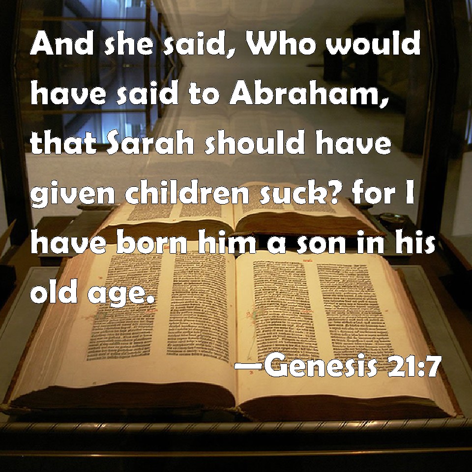 Choose a Background Genesis 21:7 And she said, Who would have said to Abraham, that Sarah should have given children suck? for I have born him a son in his old age. KJV: And she said, Who would have said unto Abraham, that Sarah should have given children suck? for I have born him a son in his old age. DRB: And again she said: Who would believe that Abraham should hear that Sara gave suck to a son, whom she bore to him in his old age. DBT: And she said, Who would have said to Abraham, Sarah will suckle children? For I have borne him a son in his old age. ERV: And she said, Who would have said unto Abraham, that Sarah should give children suck? for I have borne him a son in his old age. WBT: And she said, Who would have said to Abraham, that Sarah shall nurse children? for I have borne him a son in his old age. WEB: She said, "Who would have said to Abraham, that Sarah would nurse children? For I have borne him a son in his old age." YLT: She saith also, 'Who hath said to Abraham, Sarah hath suckled sons, that I have born a son for his old age?'Links Genesis 21:7 NIV • Genesis 21:7 NLT • Genesis 21:7 ESV • Genesis 21:7 NASB • Genesis 21:7 KJV • Genesis 21:7 Interlinear • Genesis 21:7 Commentaries • Genesis 21:7 Parallel Texts • Genesis 21:7 Bible Apps • Genesis 21:7 Parallel • Bible Hub |