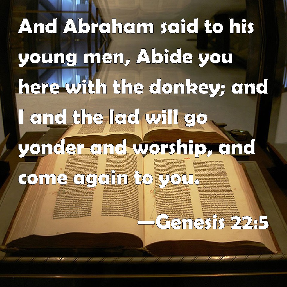 Choose a Background Genesis 22:5 And Abraham said to his young men, Abide you here with the ass; and I and the lad will go yonder and worship, and come again to you. KJV: And Abraham said unto his young men, Abide ye here with the ass; and I and the lad will go yonder and worship, and come again to you. DRB: And he said to his young men: Stay you here with the ass: I and the boy will go with speed as far as yonder, and after we have worshipped, will return to you. DBT: And Abraham said to his young men, Abide ye here with the ass; and I and the lad will go yonder and worship, and come again to you. ERV: And Abraham said unto his young men, Abide ye here with the ass, and I and the lad will go yonder; and we will worship, and come again to you. WBT: And Abraham said to his young men, Abide you here with the ass, and I and the lad will go yonder and worship, and return to you. WEB: Abraham said to his young men, "Stay here with the donkey. The boy and I will go yonder. We will worship, and come back to you." YLT: and Abraham saith unto his young men, 'Remain by yourselves here with the ass, and I and the youth go yonder and worship, and turn back unto you.'Links Genesis 22:5 NIV • Genesis 22:5 NLT • Genesis 22:5 ESV • Genesis 22:5 NASB • Genesis 22:5 KJV • Genesis 22:5 Interlinear • Genesis 22:5 Commentaries • Genesis 22:5 Parallel Texts • Genesis 22:5 Bible Apps • Genesis 22:5 Parallel • Bible Hub |