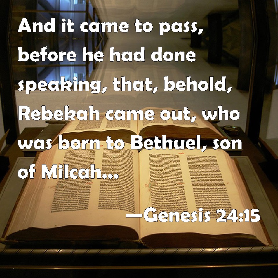 Choose a Background Genesis 24:15 And it came to pass, before he had done speaking, that, behold, Rebekah came out, who was born to Bethuel, son of Milcah, the wife of Nahor, Abraham's brother, with her pitcher on her shoulder. KJV: And it came to pass, before he had done speaking, that, behold, Rebekah came out, who was born to Bethuel, son of Milcah, the wife of Nahor, Abraham's brother, with her pitcher upon her shoulder. DRB: he had not yet ended these words within himself, and behold Rebecca came out, the daughter of Bathuel, son of Melcha, wife to Nachor the brother of Abraham, having a pitcher on her shoulder: DBT: And it came to pass before he had ended speaking, that behold, Rebecca came out, who was born to Bethuel, son of Milcah the wife of Nahor, Abraham's brother; and she had her pitcher upon her shoulder. ERV: And it came to pass, before he had done speaking, that, behold, Rebekah came out, who was born to Bethuel the son of Milcah, the wife of Nahor, Abraham's brother, with her pitcher upon her shoulder. WBT: And it came to pass before he had done speaking, that behold, Rebekah came out, who was born to Bethuel son of Milcah, the wife of Nahor, Abraham's brother, with her pitcher upon her shoulder. WEB: It happened, before he had finished speaking, that behold, Rebekah came out, who was born to Bethuel the son of Milcah, the wife of Nahor, Abraham's brother, with her pitcher on her shoulder. YLT: And it cometh to pass, before he hath finished speaking, that lo, Rebekah (who was born to Bethuel, son of Milcah, wife of Nahor, brother of Abraham) is coming out, and her pitcher on her shoulder,Links Genesis 24:15 NIV • Genesis 24:15 NLT • Genesis 24:15 ESV • Genesis 24:15 NASB • Genesis 24:15 KJV • Genesis 24:15 Interlinear • Genesis 24:15 Commentaries • Genesis 24:15 Parallel Texts • Genesis 24:15 Bible Apps • Genesis 24:15 Parallel • Bible Hub |